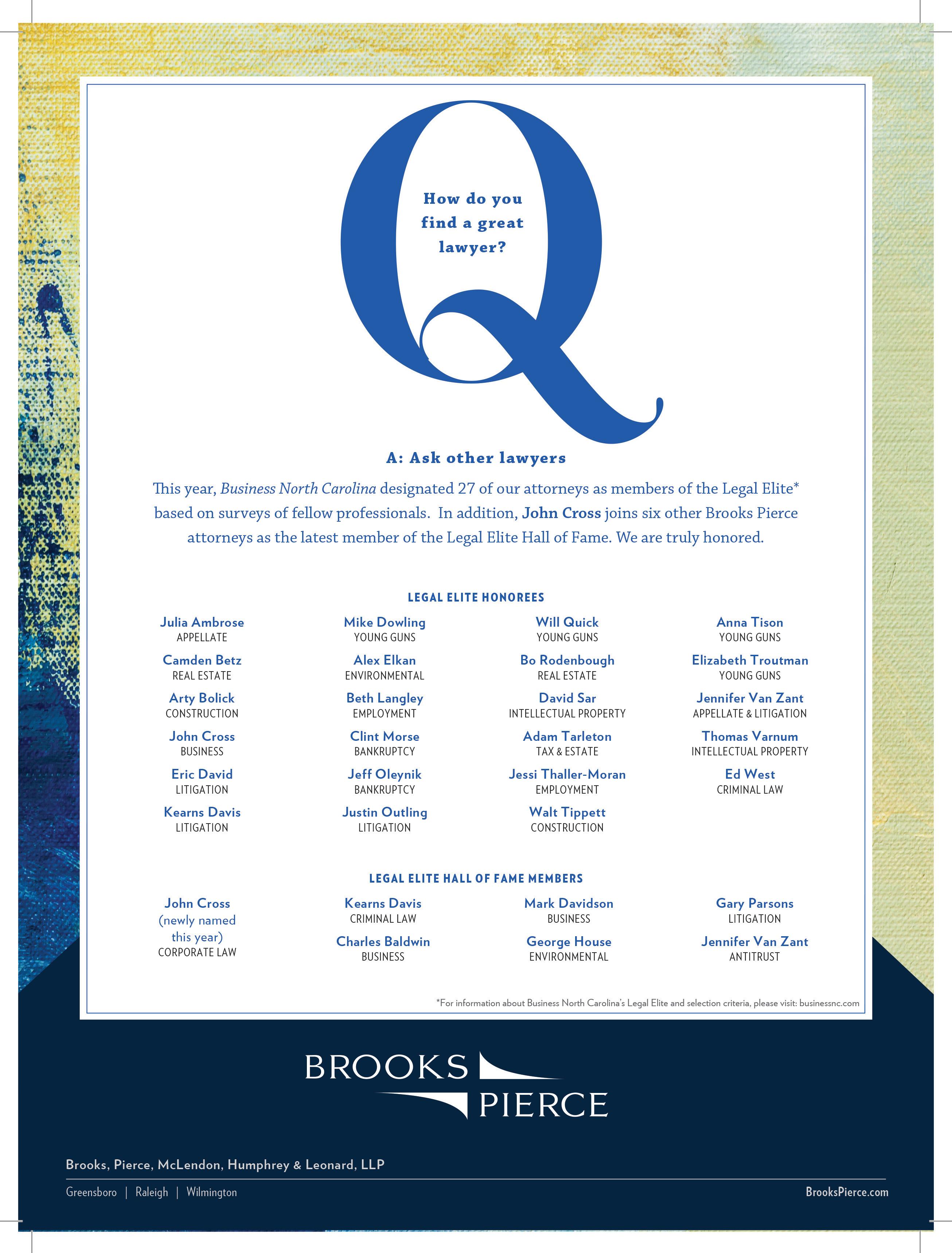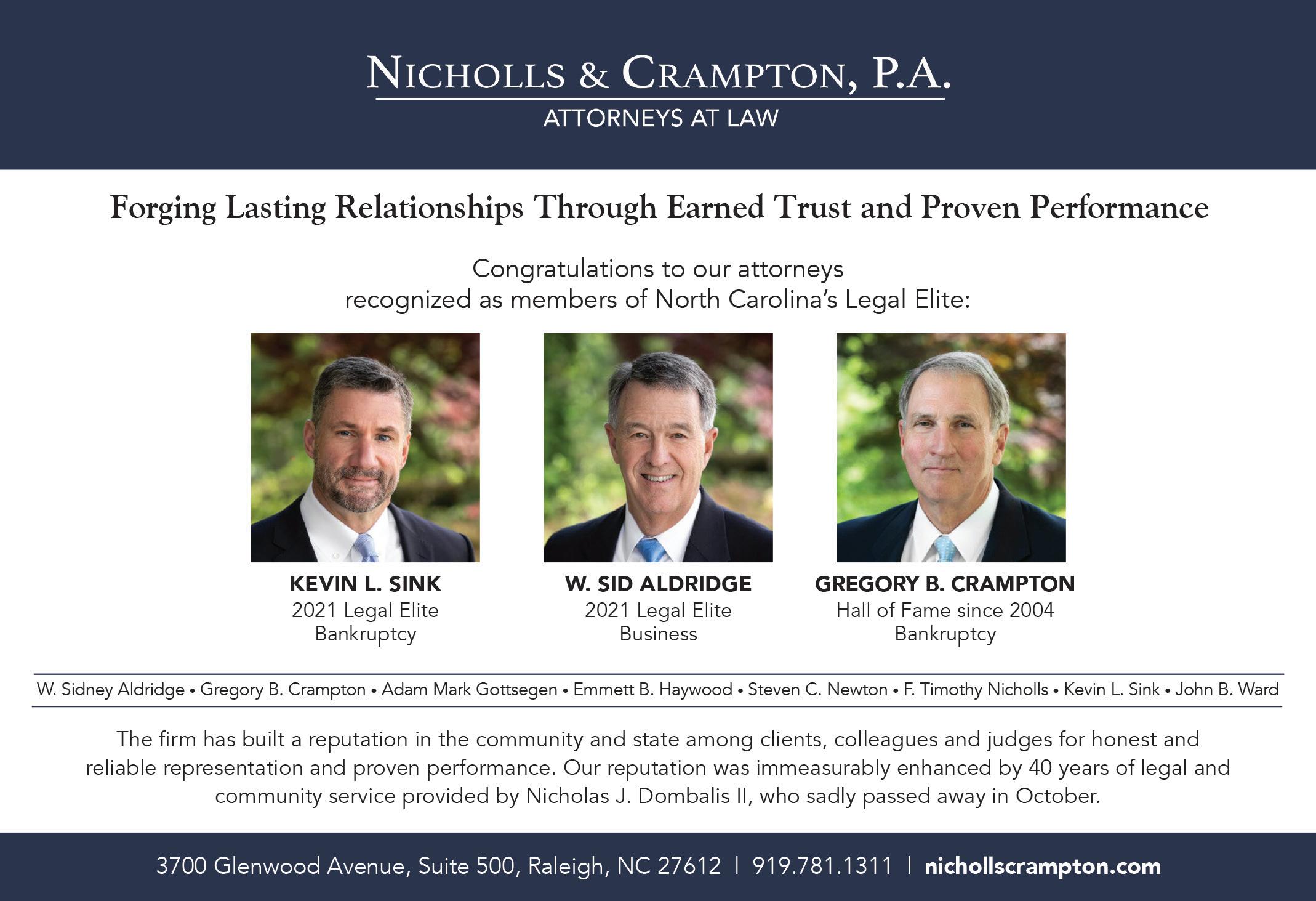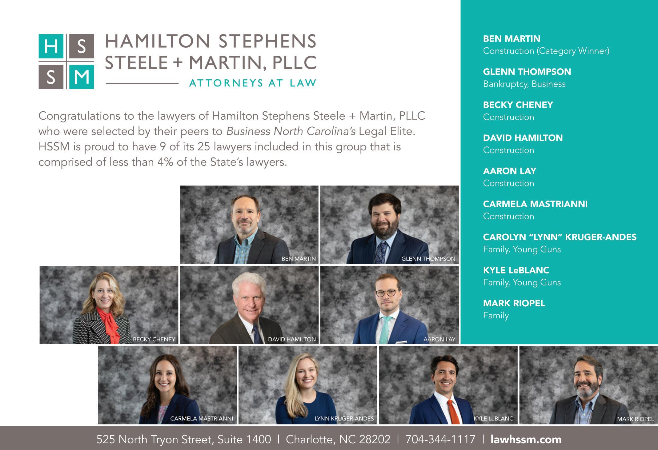 But not everything has been bleak. The pandemic has put some things in perspective for me more than ever. I’ve learned to embrace technology in a whole new capacity — I’m a self-proclaimed Zoom expert, though I still can’t figure out how to add wacky new backgrounds. Much like this year’s Legal Elite winners, whom we asked to describe a hobby they picked up during quarantine, I’ve experienced a burst of creative energy and a desire to try new pursuits, such as home-improvement projects like Ben Martin (Page 40), playing games with my family like John Cross Jr. (Page 52), or cooking like Charlotte lawyer and foodie Rick McDermott (Page 54).
