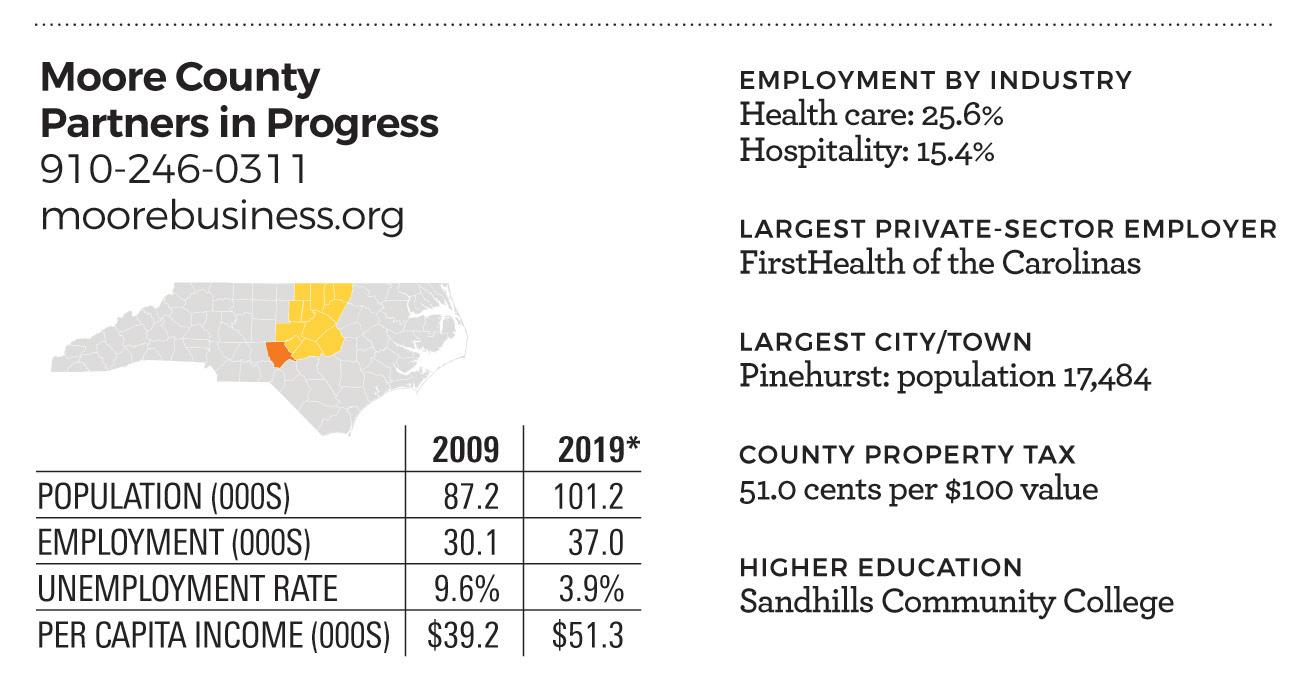 “Moore is such a huge county, and the northern area, with the pottery and outdoor activities, is a different kind of attraction to people,” Hayes says. “And in the rural areas, you don’t have the medical facilities or the tourism. It’s a different kind of attraction, so how do you expand on that? I think Moore