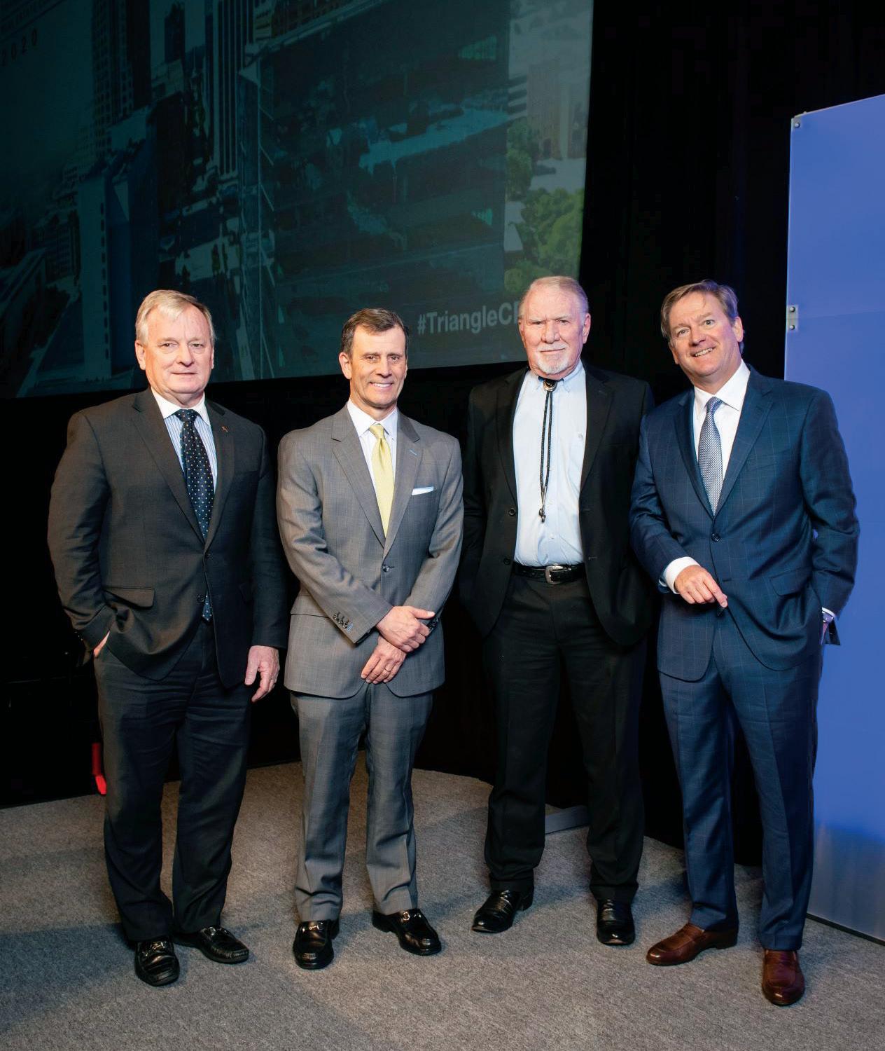 ▲ Dale Folwell, N.C. state treasurer, left, Greg Sanchez, president of Tri Properties; Steve Stroud, and Jimmy Barnes, president of NAI Carolantic Realty, at the 35th annual Triangle Commercial Real Estate Conference
