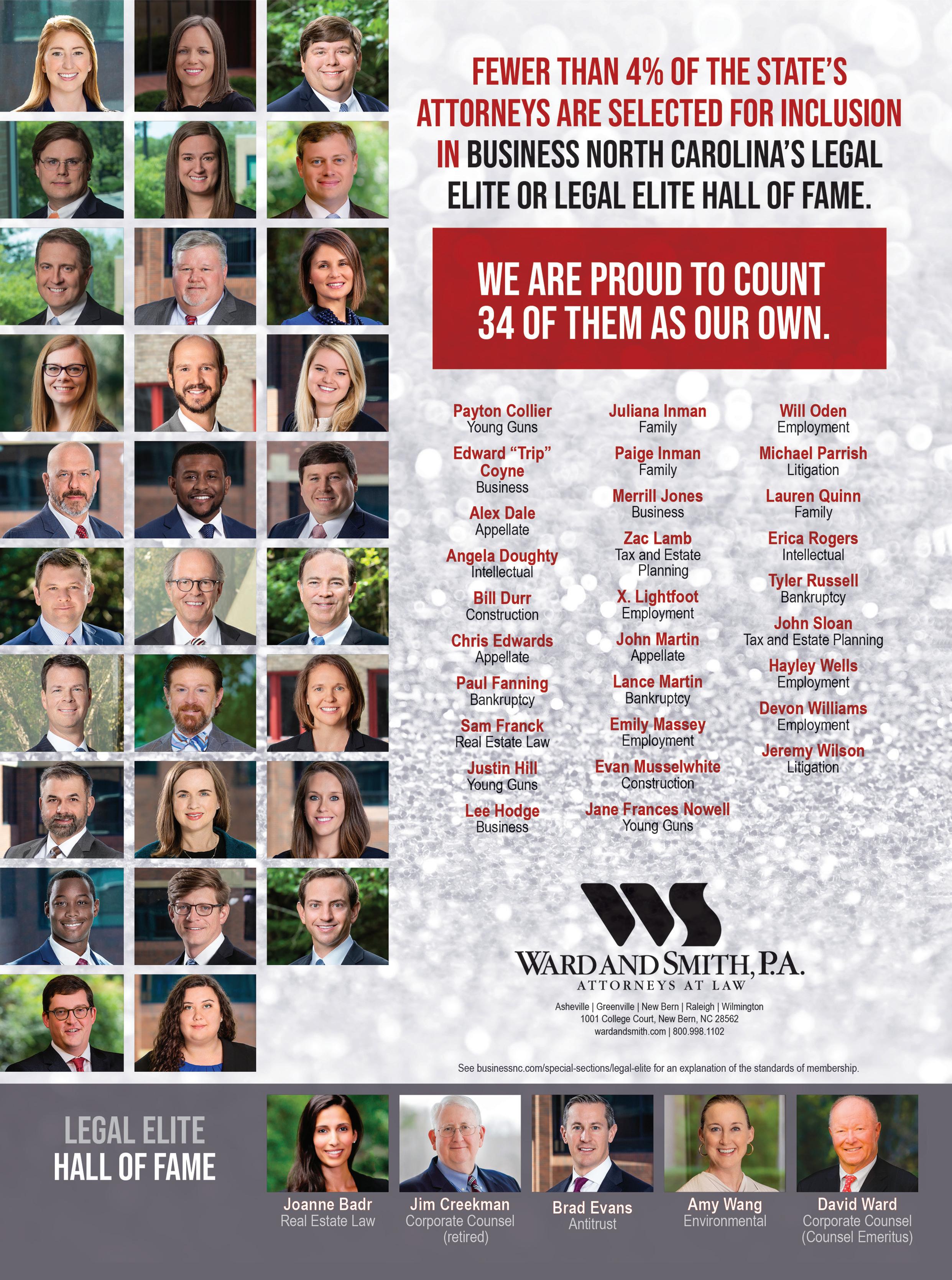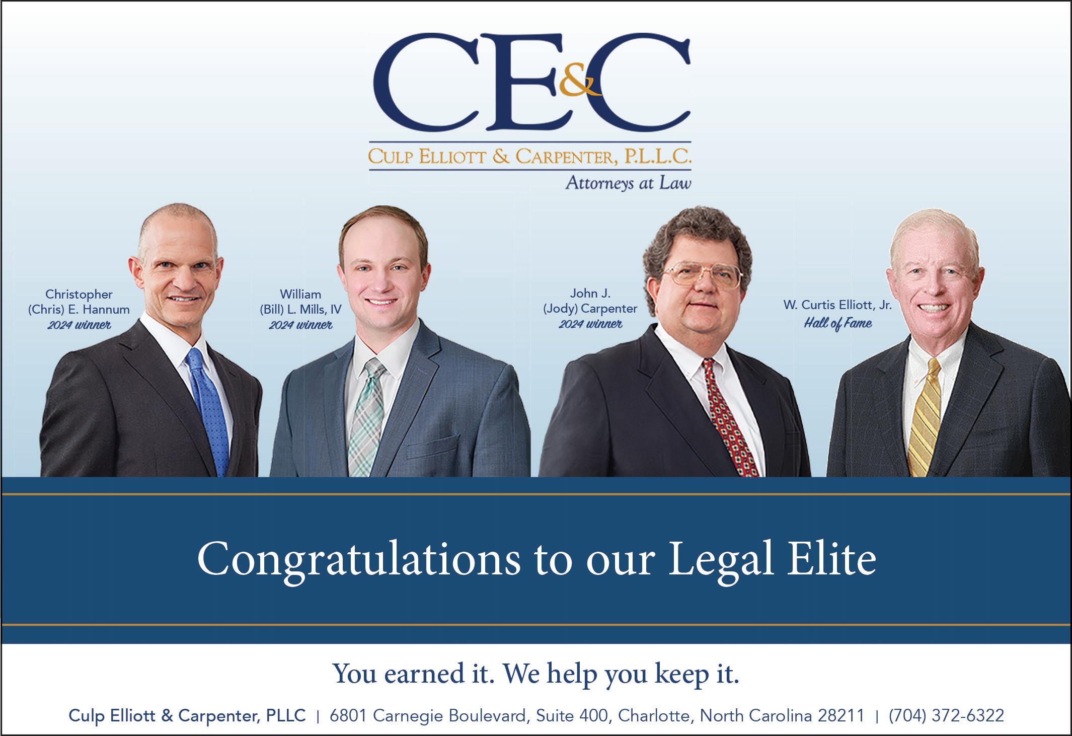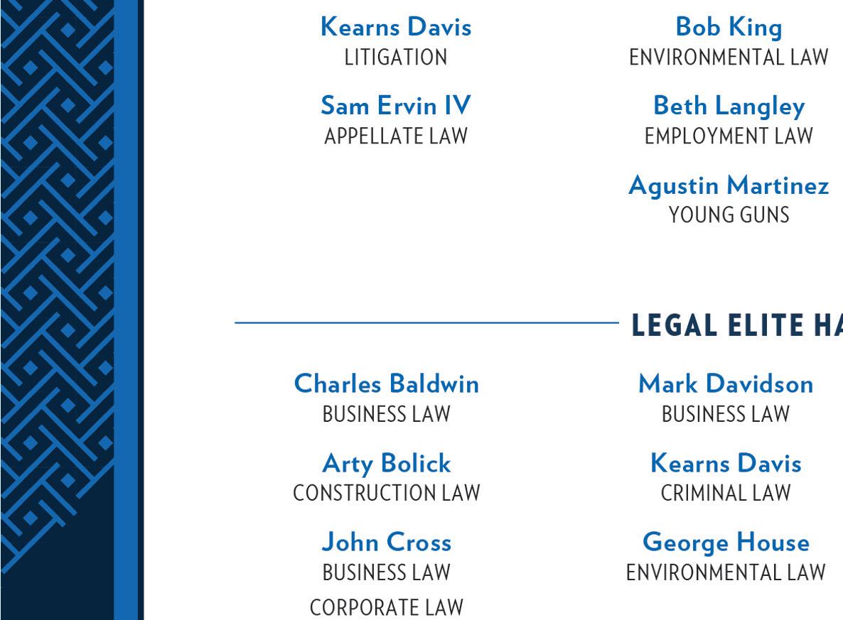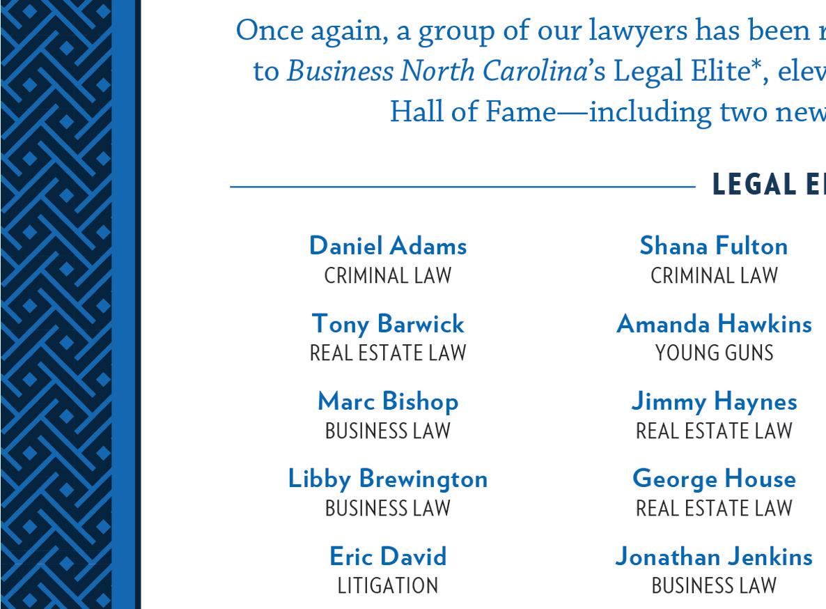 Hall of Fame: J. Christian Stevenson, Kirk Palmer & igpe, Charlotte (2012); George Mason Oliver, Oliver Friesen Cheek, New Bern (2013); Michael F. Easley Jr., McGuireWoods, Raleigh (2014); Alvaro R. De La Calle, Calle Law, Greensboro (2015); Aaron Lay, Hamilton Stephens Steele + Martin, Charlotte (2016); Elie Foy, Wyrick Robbins, Raleigh (2017); Matthew T. Marcellino, Marcellino & Tyson, Charlotte (2018); Nancy S. Litwak, Rosenwood, Rose & Litwak, Charlotte (2019); Antonia A. “Toni” Peck, Nelson Mullin, Raleigh (2020); Holden B. Clark, Holden B. Clark, Attorney at Law, Gastonia (2021); Carl Burchette, Rosenwood, Rose & Litwak, Charlotte (2022); Keith Boyette, Director of State Government Relations, North Carolina Healthcare Association, Raleigh (2023). ■