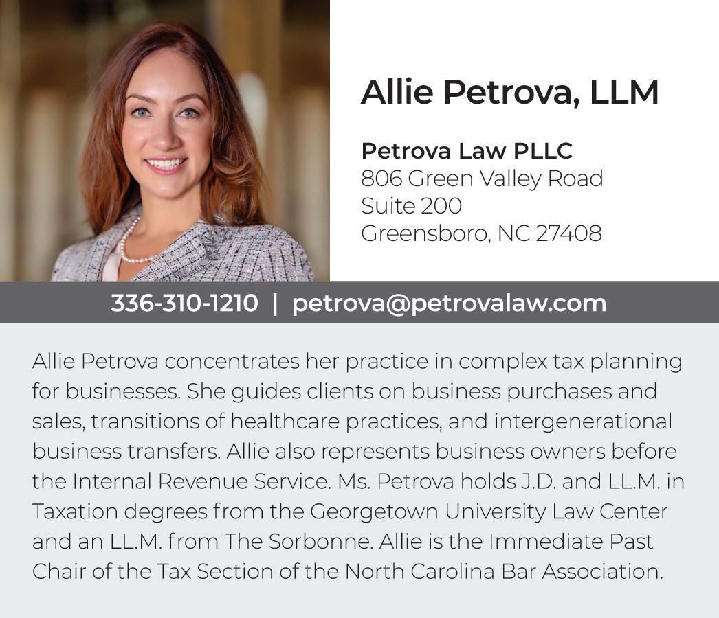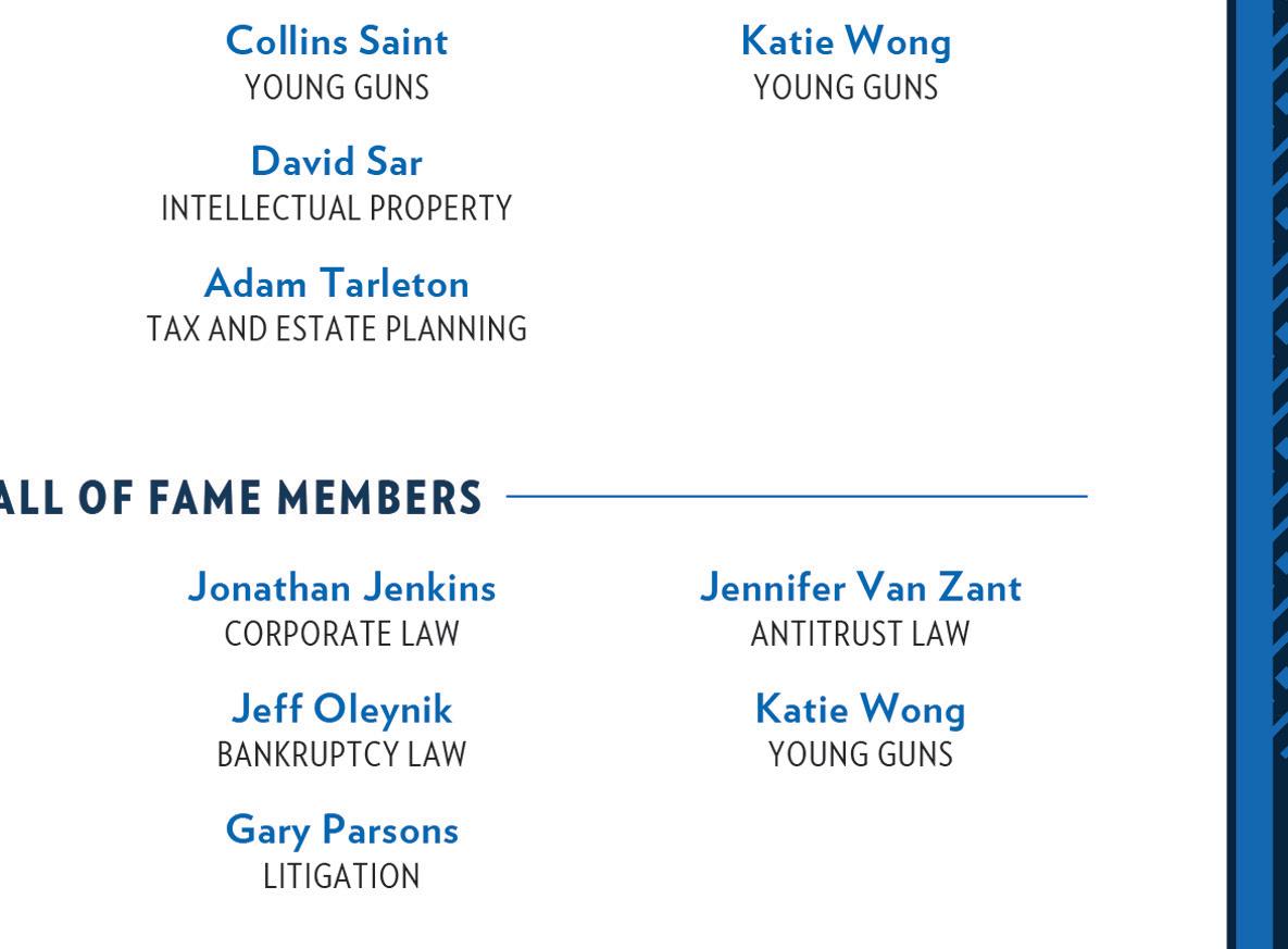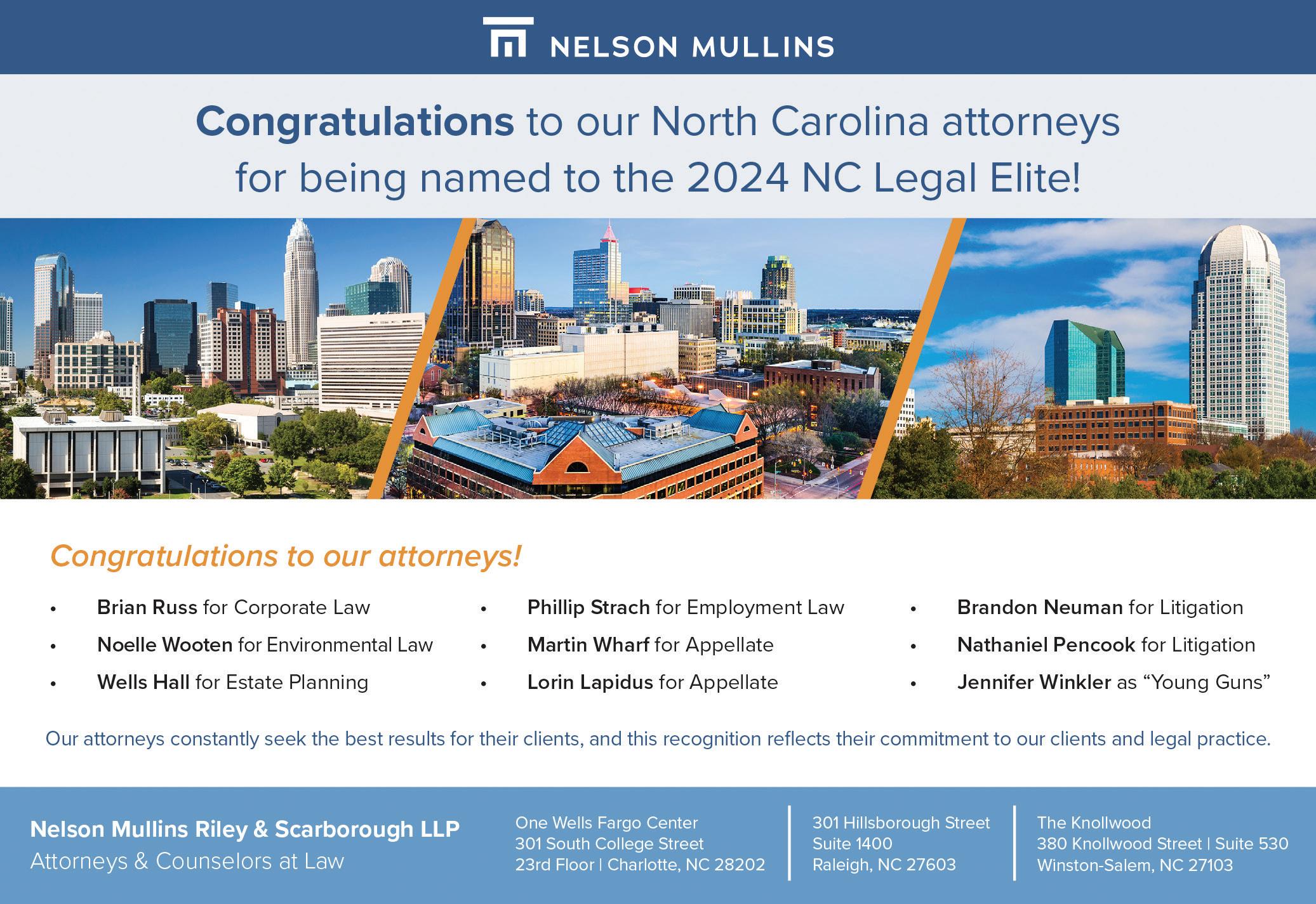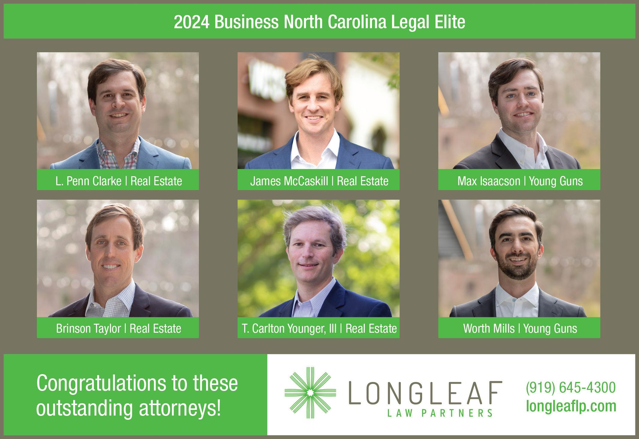 Hall of Fame: J. Christian Stevenson, Kirk Palmer & igpe, Charlotte (2012); George Mason Oliver, Oliver Friesen Cheek, New Bern (2013); Michael F. Easley Jr., McGuireWoods, Raleigh (2014); Alvaro R. De La Calle, Calle Law, Greensboro (2015); Aaron Lay, Hamilton Stephens Steele + Martin, Charlotte (2016); Elie Foy, Wyrick Robbins, Raleigh (2017); Matthew T. Marcellino, Marcellino & Tyson, Charlotte (2018); Nancy S. Litwak, Rosenwood, Rose & Litwak, Charlotte (2019); Antonia A. “Toni” Peck, Nelson Mullin, Raleigh (2020); Holden B. Clark, Holden B. Clark, Attorney at Law, Gastonia (2021); Carl Burchette, Rosenwood, Rose & Litwak, Charlotte (2022); Keith Boyette, Director of State Government Relations, North Carolina Healthcare Association, Raleigh (2023). ■