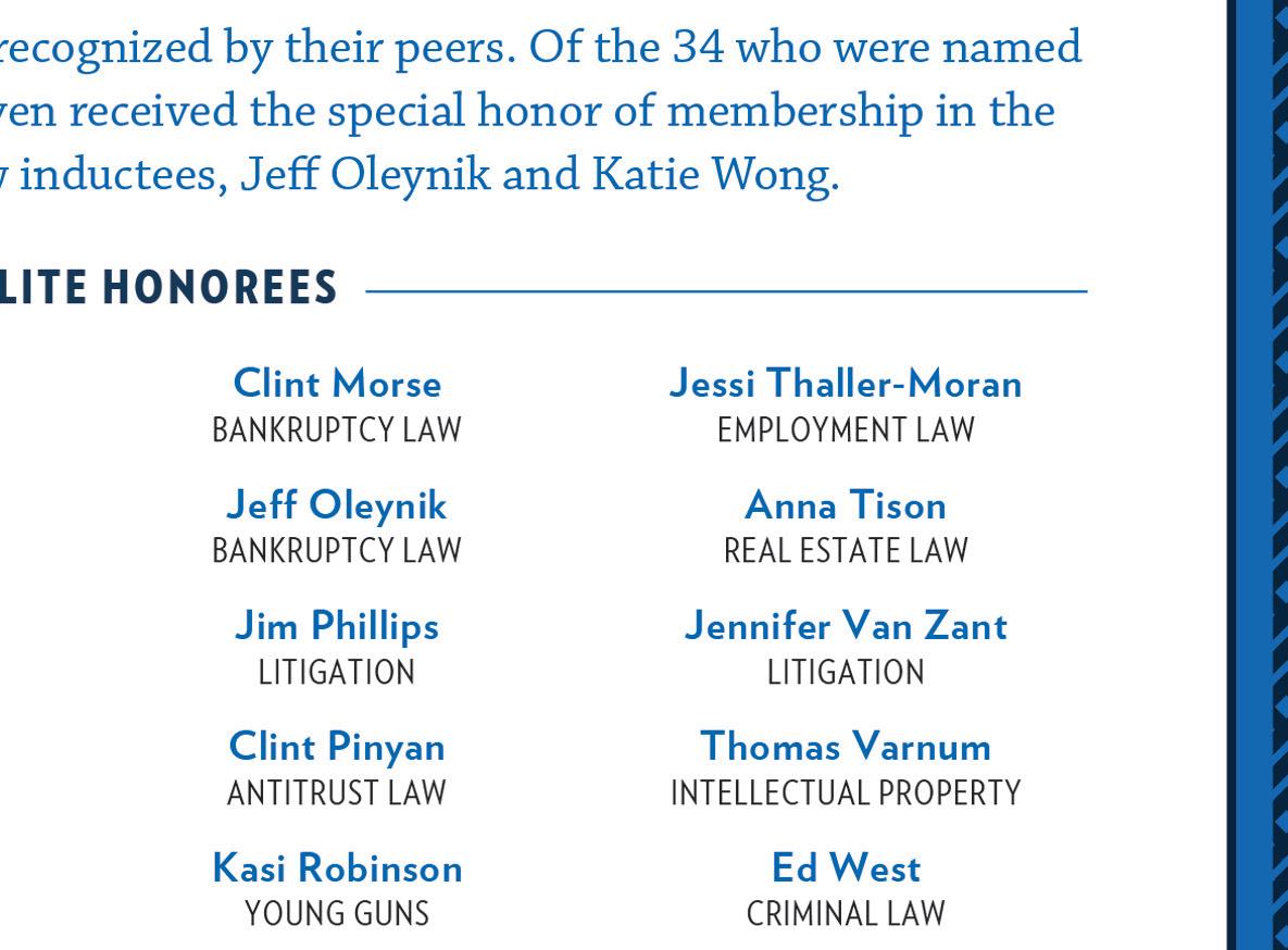 An annual highlight for BNC is presenting the Legal Elite winners of top lawyers after voting by their peers. Managing Editor Kevin Ellis and Creative Director Peggy Knaack did a terrific job producing this year’s report, which highlights New Year’s resolutions of the award winners.