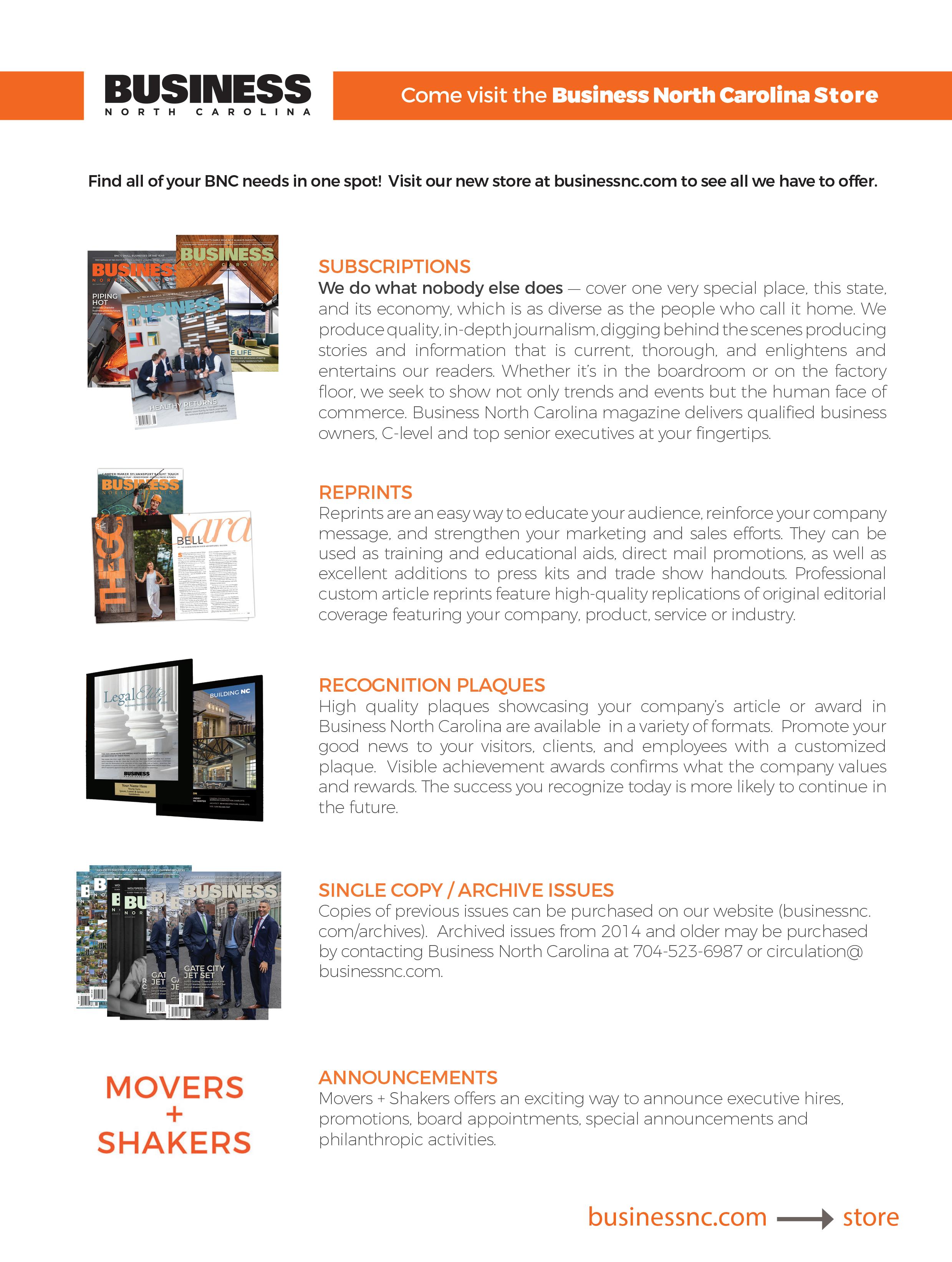 EDITORIAL: 704-523-6987 REPRINTS: circulation@businessnc.com