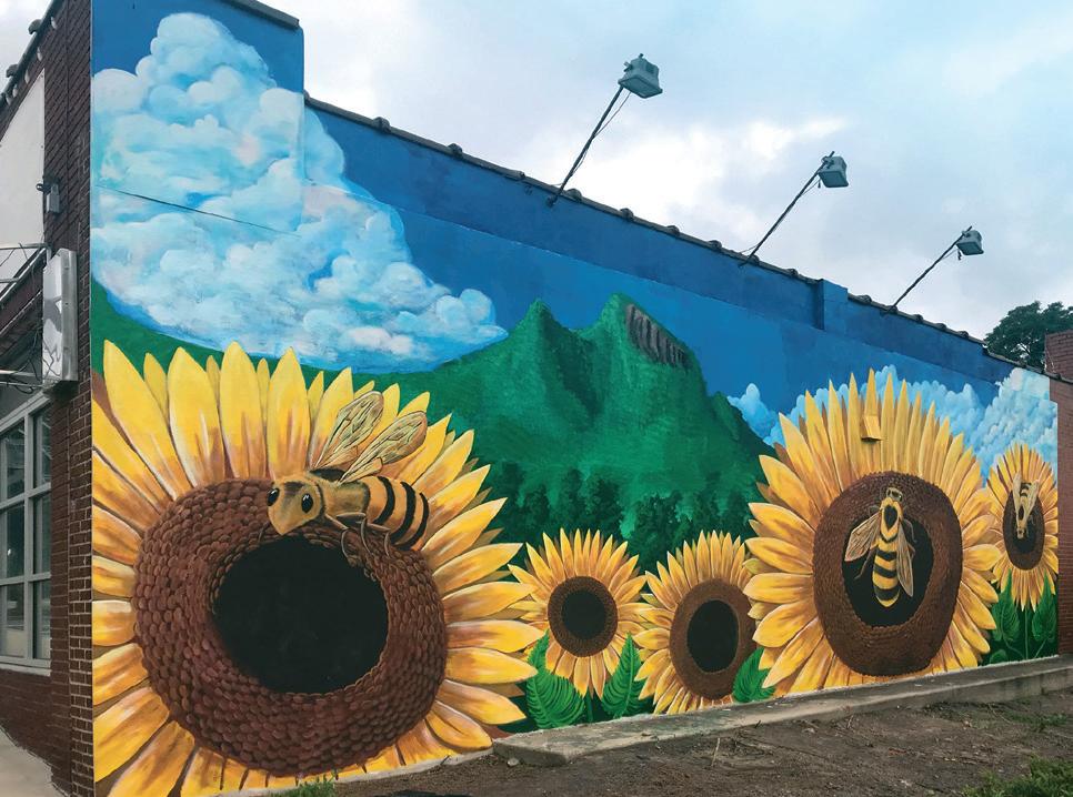 ▲ Artist Allan Potter’s downtown mural “Bessemer Bees” has a Crowders Mountain backdrop.