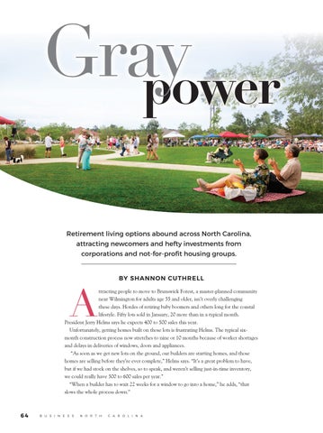 ttracting people to move to Brunswick Forest, a master-planned community near Wilmington for adults age 55 and older, isn’t overly challenging these days. Hordes of retiring baby boomers and others long for the coastal lifestyle. Fifty lots sold in January, 20 more than in a typical month. President Jerry Helms says he expects 400 to 500 sales this year. Unfortunately, getting homes built on those lots is frustrating Helms. The typical sixmonth construction process now stretches to nine or 10 months because of worker shortages and delays in deliveries of windows, doors and appliances. “As soon as we get new lots on the ground, our builders are starting homes, and those homes are selling before they’re ever complete,” Helms says. “It’s a great problem to have, but if we had stock on the shelves, so to speak, and weren’t selling just-in-time inventory, we could really have 500 to 600 sales per year.” “When a builder has to wait 22 weeks for a window to go into a home,” he adds, “that slows the whole process down.”