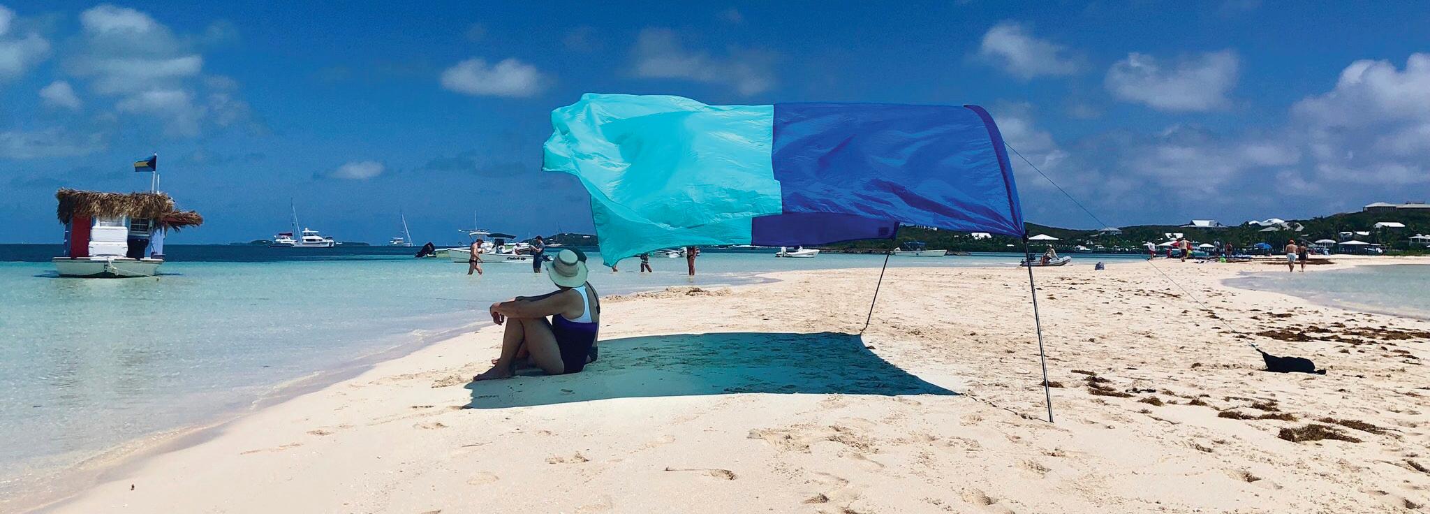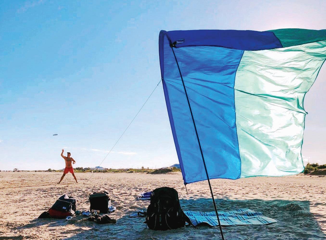 “It's really lightweight so anyone in your family can carry it, from a young child to an older adult,” Scott says. As many as six adults can sit comfortably under the shade. “And because it works with the wind and not against it, it can't have the same kind of danger of umbrellas and tents that you see on the beach that can get picked up by high winds and tumble down the beach. So it's a little safer.”
