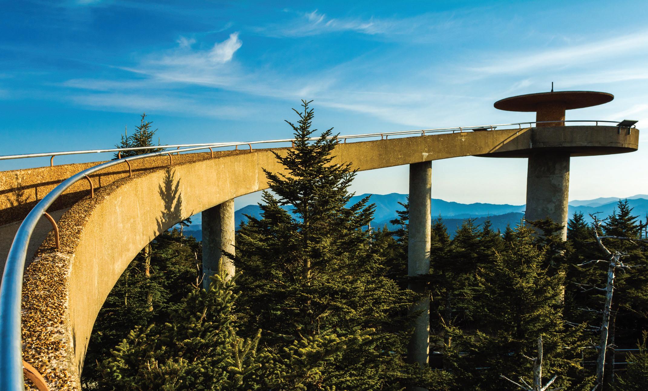 project. From the summit parking lot, a steep half-mile paved trail connects visitors to the observation tower’s modern mushroom-cap design.