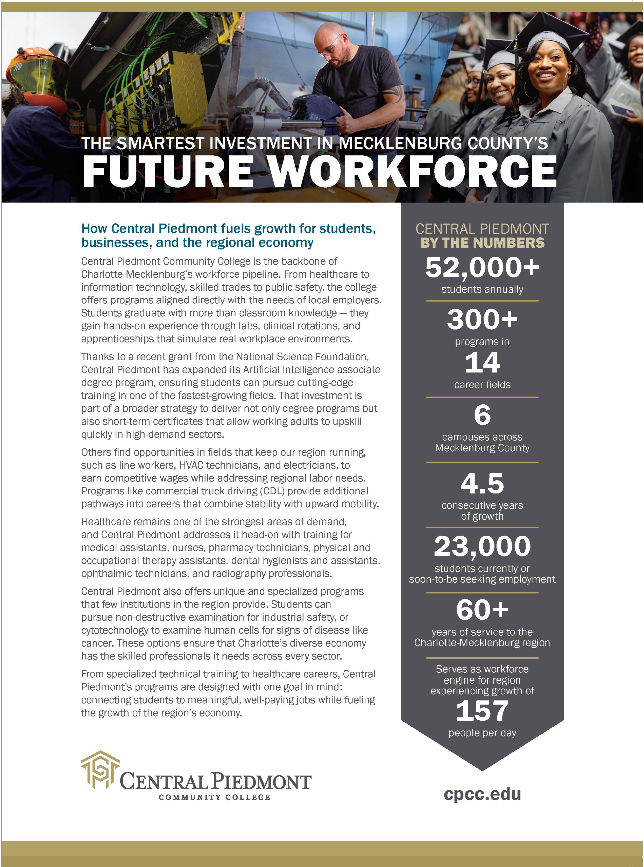 “Over the next five years, there will be a strong emphasis on supporting existing industries, particularly those, such as manufacturing, that create greater opportunity through career laddering,” she says. “These pathways enable employees to develop and enhance their skills, increasing their long-term value in the workforce. The EDC will focus on implementing programs that support these businesses and help them grow and thrive in Cabarrus County.”