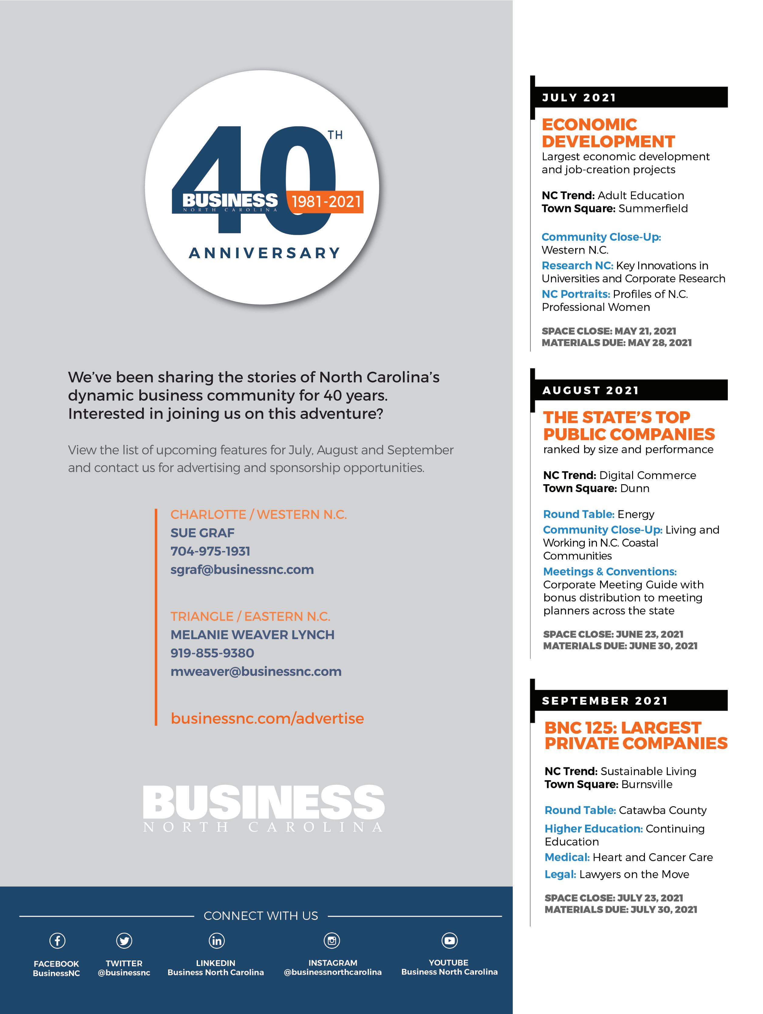 ACCOUNT MANAGERS Sue Graf, western N.C. 704-523-4350 sgraf@businessnc.com