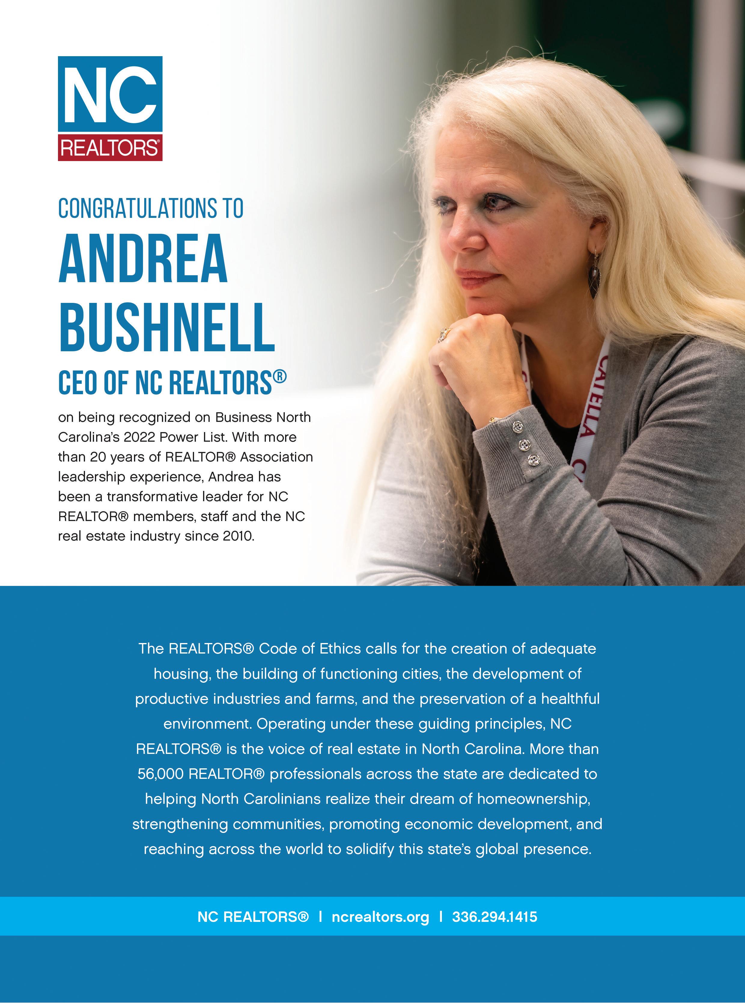 Special thanks to my colleagues for the intense effort to produce this publication, particularly designers Peggy Knaack and Ralph Voltz. Peggy came up with the retro images of vintage toys and old equipment models to combine a glimpse of history while honoring some exceptional people. They should spark some memories for many readers — and maybe questions from younger ones. We are most appreciative of our sponsors and the many people who contributed to this snapshot of North Carolina’s business leadership in 2022. ■