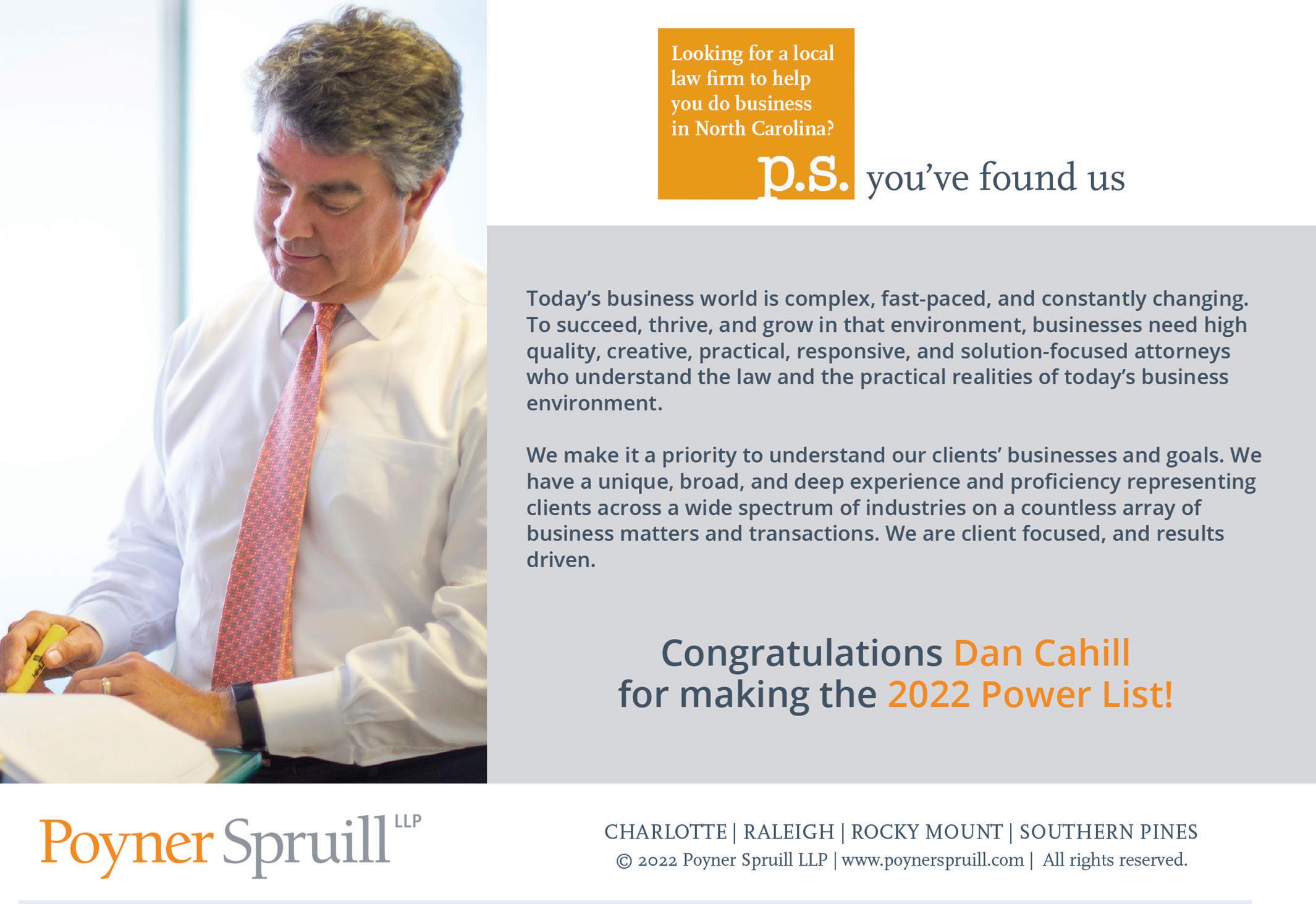 The Appalachian State University graduate, who has a UNC Chapel Hill law degree, is a powerful player in local and state transportation and business matters. His legal practice focuses on business and real estate litigation, zoning and land use.