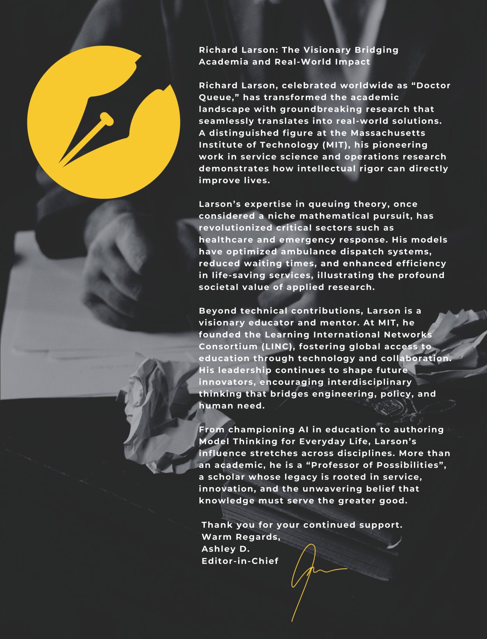 Renowned globally for his pioneering contributions to service science and operations research, Richard Larson stands at the forefront of innovation at the Massachusetts Institute of Technology (MIT). Affectionately dubbed “Doctor Queue,” Richard’s research has redened how we perceive and design systems that impact our daily lives. His ability to translate abstract mathematical theories into impactful, real-world applications reects the transformative potential of academia when directed toward societal good. Based on The Business Tycoon Magazine’s June 2025 cover story, this article explores the remarkable journey of a scholar whose inuence continues to inspire and reshape industries and public services alike.