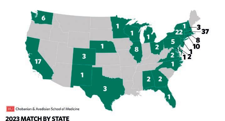 New York (22), California (17), and Connecticut (10) were the next most popular matched states. The class matched in a range of programs, with internal medicine (32), anesthesiology, pediatrics, and general surgery (13 each), and emergency medicine and neurology (11 each) as the top specialties. ●