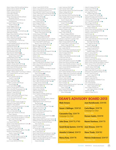 Miriam E. Berliner (SSW’54) and Richard Berliner Berthlyn M. Bernier (SSW’97, SPH’99) < Elizabeth I. Bernier (SON’79) < arthur G. Bernstein (SSW’70) Suzanne Black (SSW’84) Hannah G. Bloch (SSW’90) Stanley S. Blumenstein (CaS’58) and Rachel Blumenstein (SSW’54) Carol S. Blumental (CaS’63, SSW’65) and George Blumental Genevieve O. Boehme (SSW’00) and Michael W. Boehme < Chana R. Bogsted (SSW’91) Claudia I. Boldman (SSW’80) < Jane davis Bose (SSW’47) < James E. Bourque (SSW’73) and Gail Bourque < Joellen Bower (SSW’85) Regina E. Bower (SSW’92) and Robert a. Bower < Brian J. Brady (SSW’78) < Elinor C. Brady (SSW’70) and Patrick F. Brady Jennifer S. Brandel (SSW’98) < J. Lynn Branfman (SEd’72, SSW’87) and alan R. Branfman Garland R. Brassfield (SSW’80) and Louis R. Silipo Christiana Bratiotis (GRS’09) Leslie Brennan (SSW’94) < Marilyn S. Brier (SSW’69) and Michael J. Brier < Katherine I. Britton (SSW’03) < Sara M. Brockway (SSW’07) < Miriam Bronstein (SSW’90) << Jeffrey a. Brown (LaW’73, LaW’75) and Barbara H. Brown (SSW’71) < Sukhdeep Bubbra (SSW’97) < Paula L. Budnitz (SSW’69) and Mark E. Budnitz < Rosalie S. Budnoff (SSW’50) George R. Bulger (SSW’67) < Elizabeth a. Burden (SSW’91, SPH’92) < Barbara L. Burka (SSW’85) and Eliot M. Burka Karen E. Burns (SSW’84) and James F. Burns Elizabeth W. Buswick (SSW’10) < Edward M. Butrick (SSW’85, SEd’74) Ronald L. Caldarone (SSW’77) and Teresa a. Caldarone John F. Canavan (SSW’87) and Louise L. Canavan Ronald Caplain < James M. Caramello (SSW’58) and Caroline d. Caramello < Maria V. Carrasco Pavez < Carol K. Carroll (SSW’94) < Elizabeth V. Carruthers (SSW’94) and John B. Pendleton < Louis d. Carter (SSW’54) << Crista M. Cavicchio (SSW’05, SEd’06) Peter K. Chan (SSW’74) and Laura H. Chan < Myrna Chan MacRae (SSW’98, SPH’99) Stephanie T. Chang (SSW’10) < Pamela a. Charney (SSW’91)< denise S. Chazin (SSW’12) and Steve M. Chazin Yi-Chin Chen (CaS’01, SSW’03)< Troy W. Clark (SSW’79) and Jane a. Clark < Rosenie Clervil < Susan J. Coe (SSW’72) and S. douglas Coe alexander M. Cohen (SSW’10, SPH’11) < Margaret H. Cohen (SSW’81) Robert H. Cohen (SSW’56) and Ruth K. Cohen < Catherine a. Coleman (SSW’51) < Brett C. Collins (SSW’07) < Cindy Jo a. Collon (SSW’94) < Joanna R. Colton (SSW’96, CaS’89) and david J. alperovitz Jayde Campbell (SSW’02) and Kerry L. Conaghan < Keith a. Conant (SSW’90) and Marcia S. Conant < Leonard S. Confar (STH’51, SSW’53) and Nancy S. Confar (STH’51) < amy Conwell (SSW’92) < James E. Cooney (SSW’78) and Norma a. Cooney < Byron a. Coparanis (SSW’54) C. Nelson Corey (SEd’53) and Kathleen M. Corey (SSW’51) < Richard S. Corry (SSW’57) and Virginia L. Clower < Norman d. Corwin (MEd’57) and dorothy J. Corwin (SSW’57) << Mary J. Cowan (SSW’10) < Jane R. Coyle (SSW’76) and d. Lorne Coyle < Barbara L. Cracknell (MET’78, SSW’91) and Terry a. Cracknell << Lisa a. Cremer (SSW’08, SPH’09) <