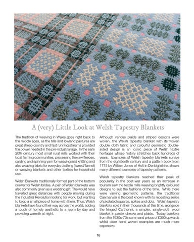 Although various plaids and striped designs were woven, the Welsh tapestry blanket with its woven double cloth fabric and colourful geometric doublesided design is an iconic piece of Welsh textile heritages whose history stretches back hundreds of years. Examples of Welsh tapestry blankets survive from the eighteenth century and a pattern book from 1775 by William Jones of Holt in Denbighshire, shows many different examples of tapestry patterns. Welsh tapestry blankets reached their peak of popularity in the post-war years as an increase in tourism saw the textile mills weaving brightly coloured designs to suit the fashions of the time. While there were varying geometric patterns, the traditional Caernarvon is the best known with its repeating series of pixelated squares, spikes and dots. Welsh tapestry blankets sold in their thousands at this time, alongside the fringed Carthenni, a simpler, single-cloth wool blanket in pastel checks and plaids. Today blankets from the 1930s-70s command prices of £300 upwards whilst older hand woven examples are much more expensive. 16