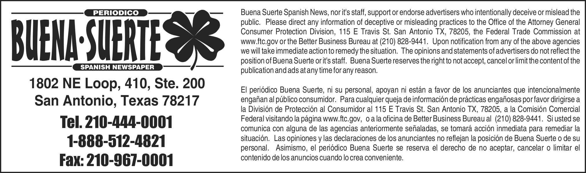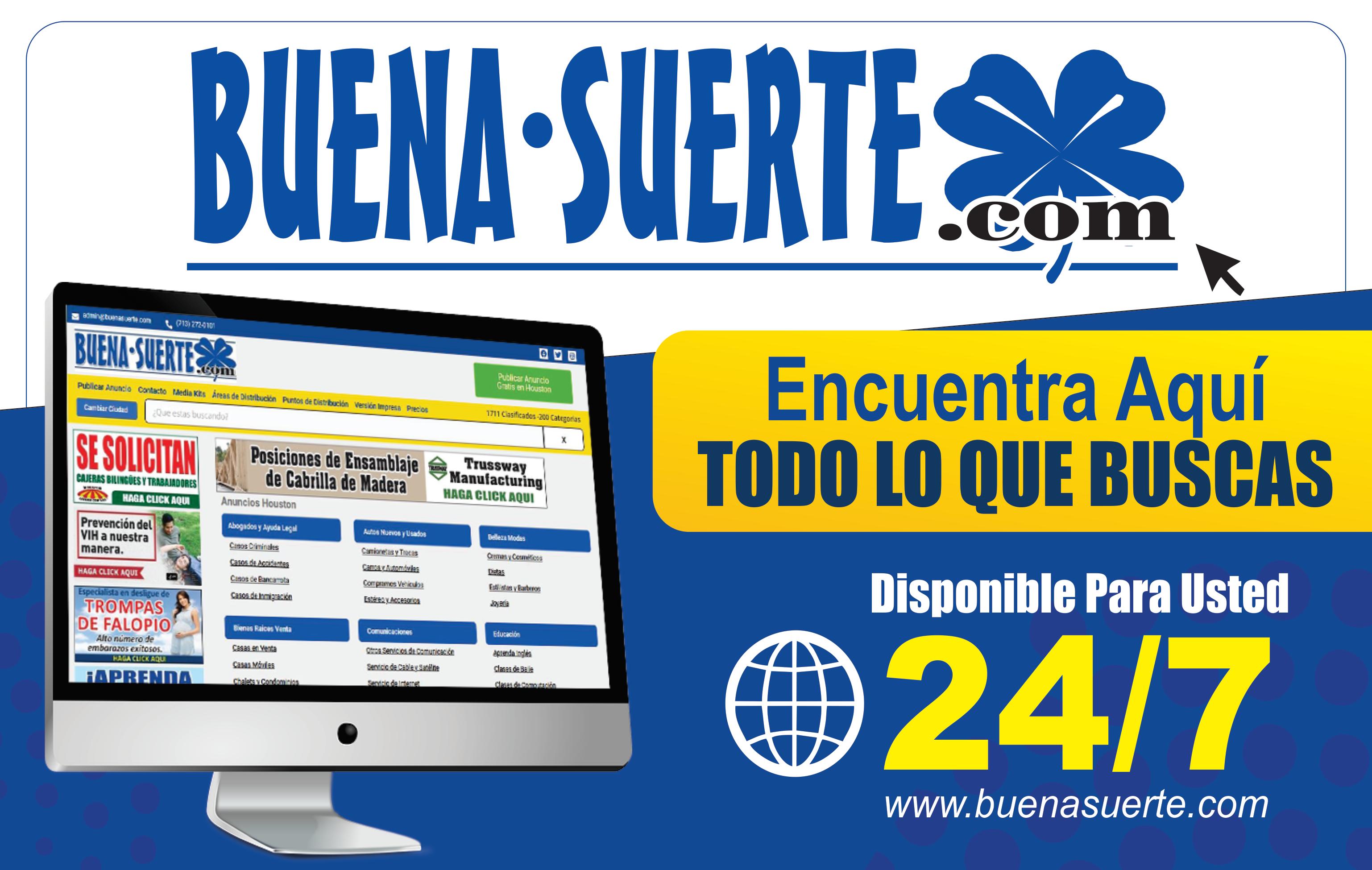 ANUNCIASE EN LAS OTRAS CIUDADES que publica Buena Suerte, Houston, Austin, y San Antonio. También en la pagina web www.buenasuerte.com