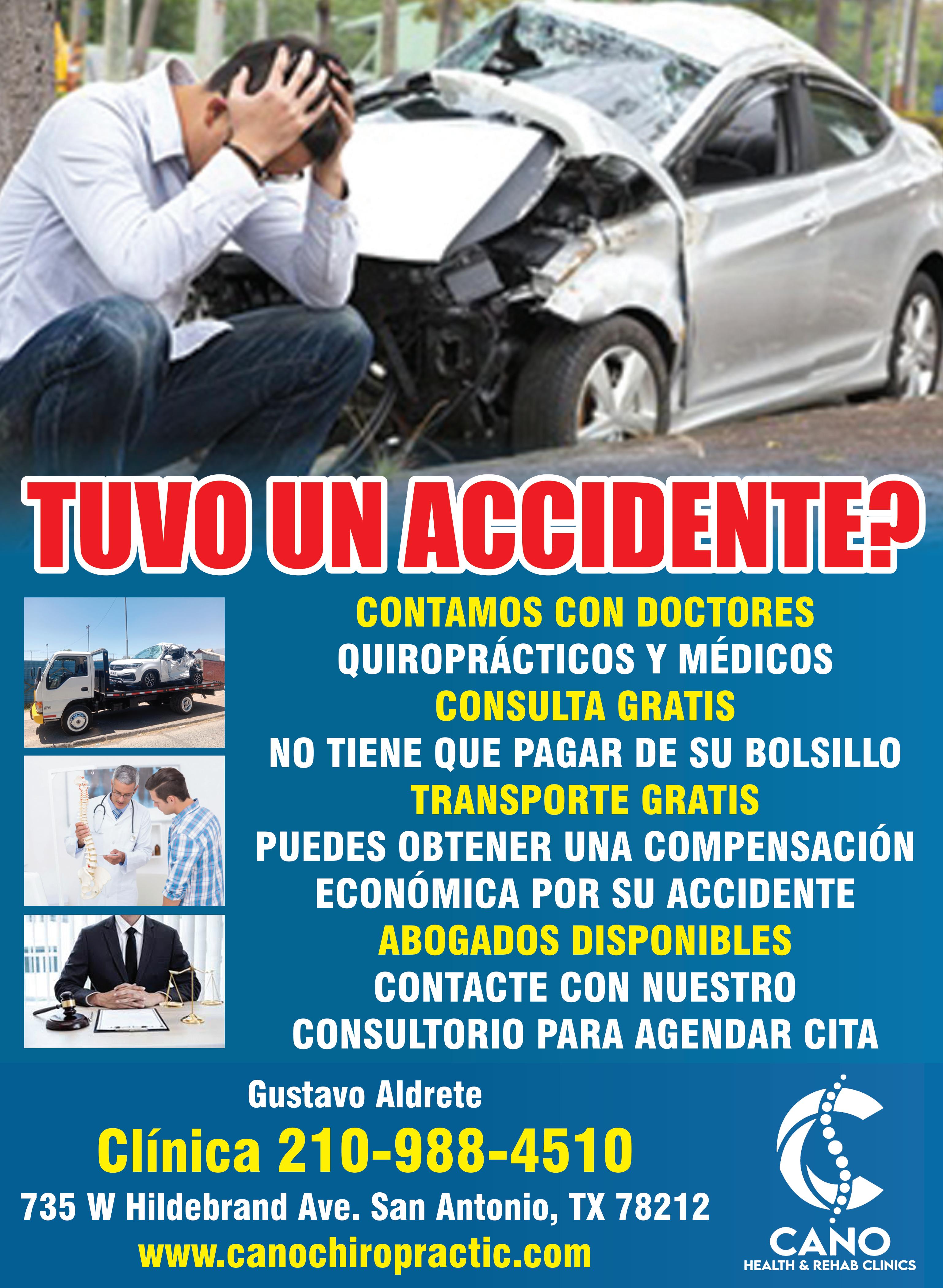 ACCIDENTE, gRATIS! CANO HEALTH & REHAB TE APOyA DESPUÉS DE UN ACCIDENTE. CONSULTA gRATIS CON DOCTORES qUIROPRáCTICOS y mÉDICOS No hay pagos de bolsillo. Podrías calificar para una compensación económica. Contamos con abogados disponibles para tu caso. ¡Llama o agenda tu cita al 210-988-4510!