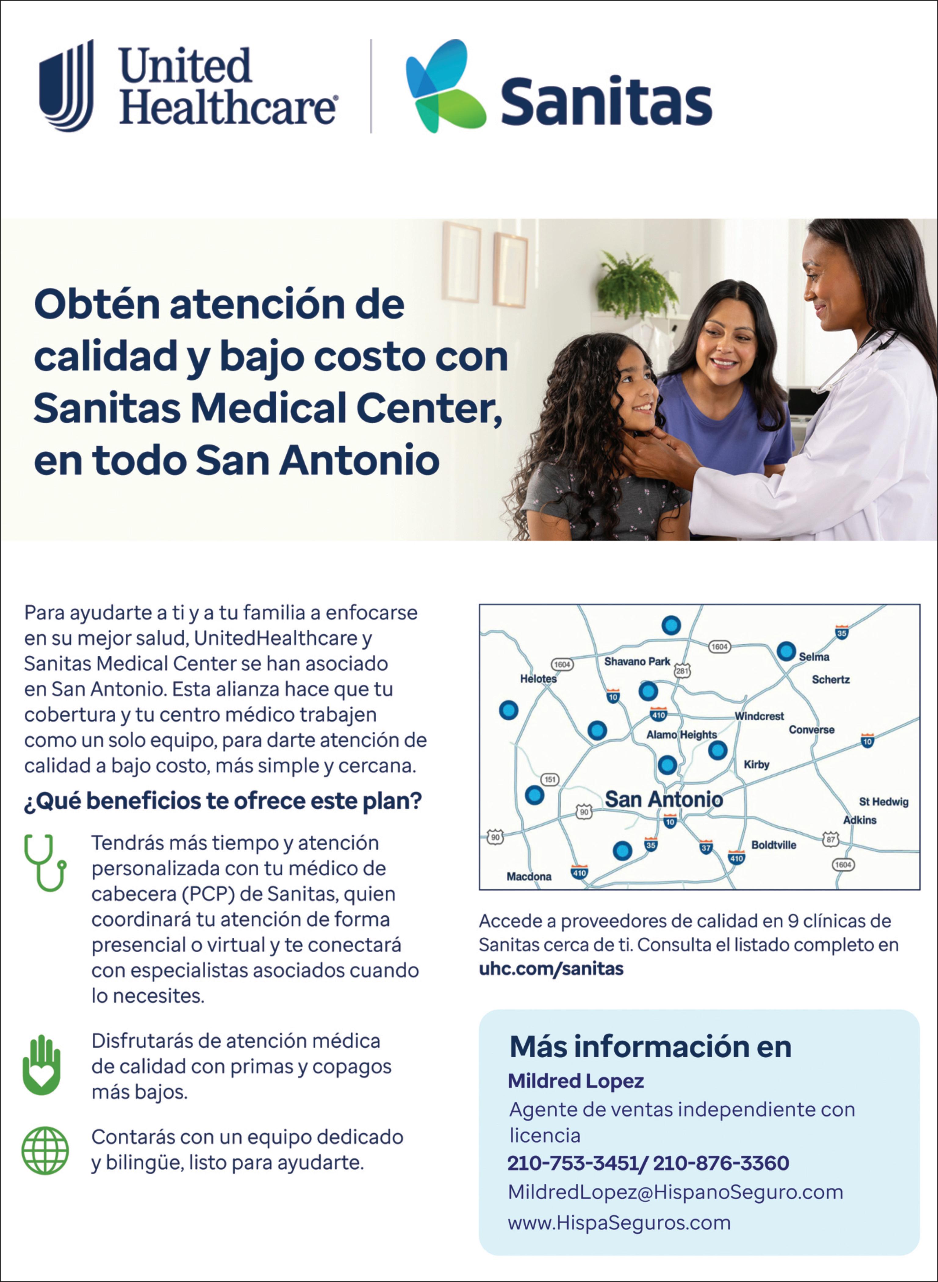 PARA AyUDARTE A TI y A TU FAmILIA A ENFOCARSE EN SU mEjOR SALUD, UNITED HEALTHCARE y SANITAS mEDICAL CENTER SE HAN ASOCIADO EN SAN ANTONIO Esta alianza hace que tu cobertura y tu centro médico trabajen como un solo equipo, para darte atención de calidad a bajo costo, más simple y cercana. llamanos al 855-263-2531