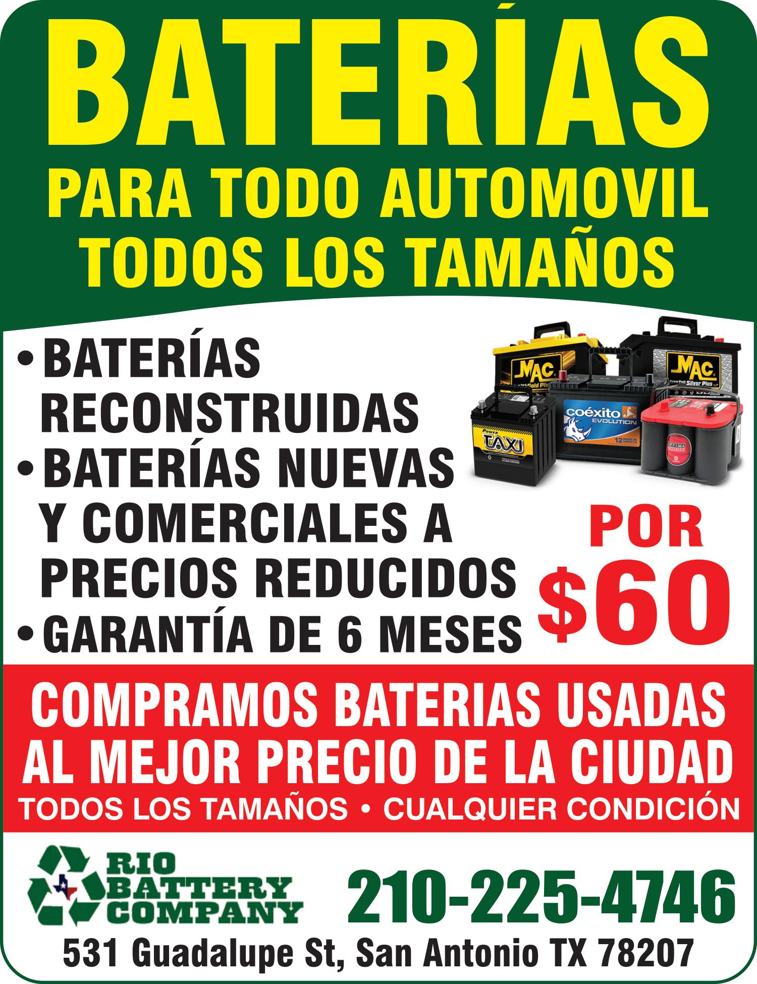 PAgAmOS EL mEjOR PRECIO POR TU BATERíA VIEjA. CUALqUIER CONDICIóN/TAmAñO. RIO BATTERy COmPANy. COmPRA y VENTA DE BATERíAS NUEVAS y USADAS PARA MAS INFORMACION 210-225-4746