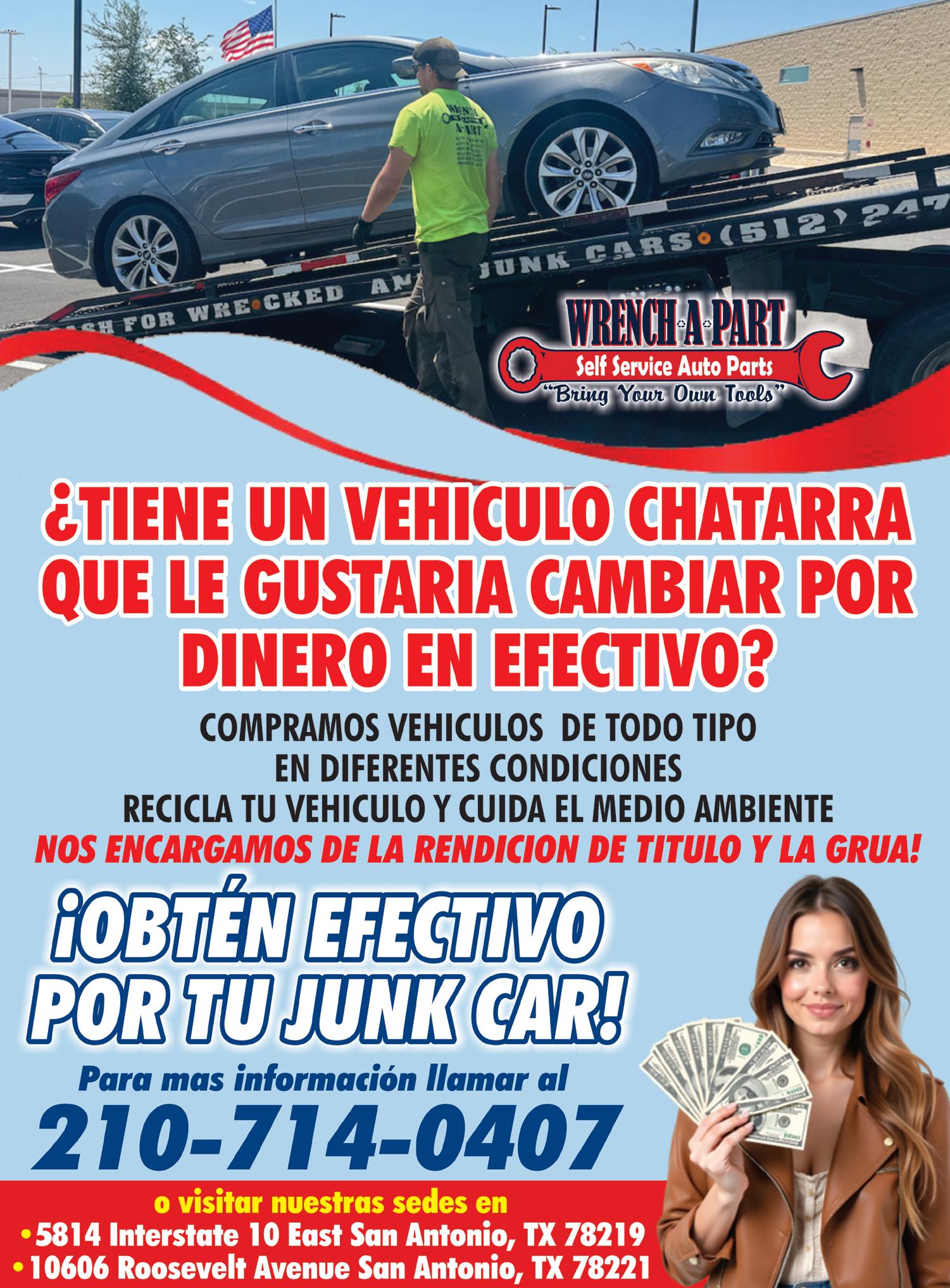 TIENE UN VEHíCULO CHATARRA qUE LE gUSTARíA CAmBIAR POR DINERO EN EFECTIVO? Compramos vehículos de todo tipo en diferentes condiciones. Llamar al 210-714-0407 para mas informacion