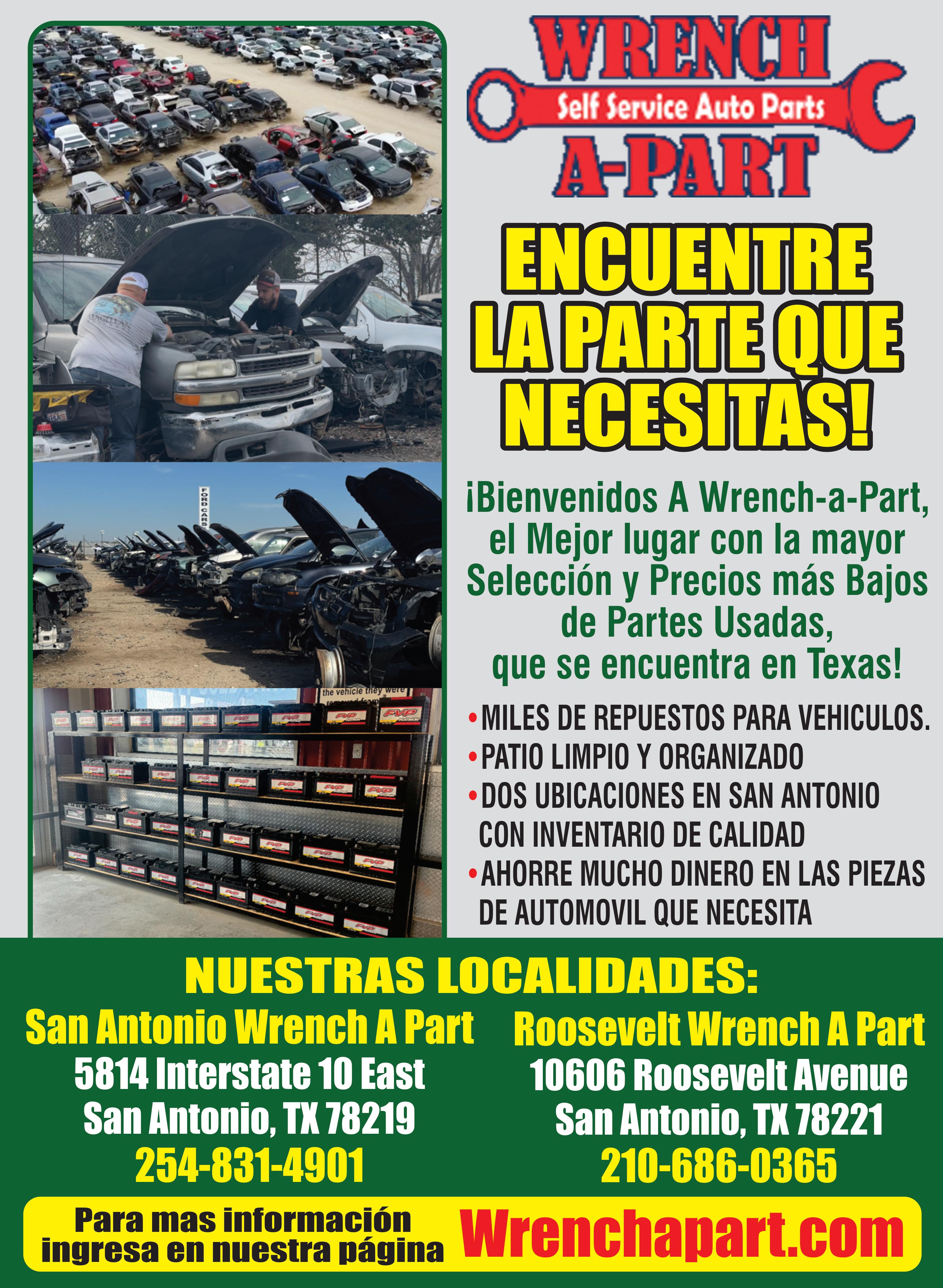 WRENCH-A-PART mILES DE REPUESTOS PARA VEHíCULOS, LLAmE yA 254-831-4901 Nuestras localidades de Wrench-A-Part se encuentran en Austin, Belton, Lubbock, Holland y San Antonio. Wrench-A-Part en total tiene más de nueve mil carros para partes en inventario