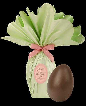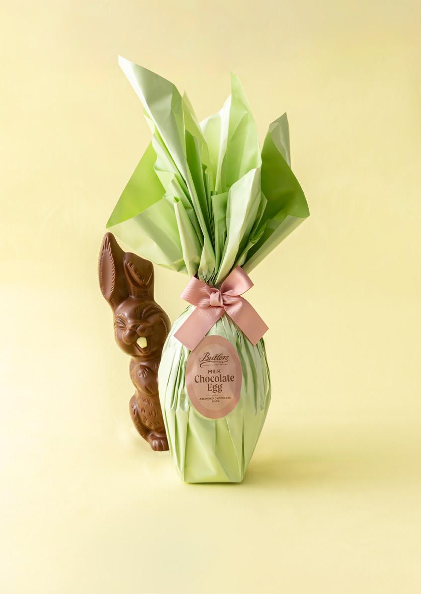 Wrapped in vibrant pearlised pink and green and tied with a bow, these eggs include a milk chocolate egg and a selection of wrapped chocolates.