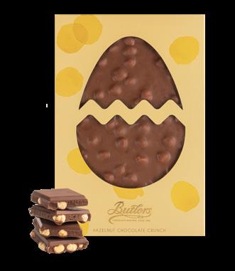 Milk chocolate with whole roasted hazelnuts and butterscotch pieces.