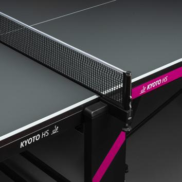 The Butterfly Kyoto HS is a compact table tennis table equipped with a highquality, fixed net set1. The special multicoated 25mm surface has a very good bounce. Thanks to the ITTF approval, it can be used for competitive play, but also in schools, leisure facilities or in the private sector. The chassis is equipped with 4 swivelling wheels2 (diameter 100 mm with rubber tread), 2 of which have a parking brake. Heightadjustment glides3 on the rear stand legs ensure compensation for unevenness and different stand heights of up to 25 mm. The innovative bracket system4 with brackets under the frame profile unlocks both safety catches at the same time. The locking takes place automatically in the stop and playback position5 The playback position also allows for individual training. The table must be assembled after delivery (2 individual boxes).