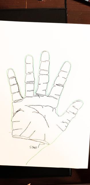 2. Now, with a fineliner or pencil, draw a continuous line over your traced hand black line in the reference image Fill in all the marks, lines or observations you see of your hand You cannot lift the drawing tool off of the page Only make one continuous line to illustrate all that you see.