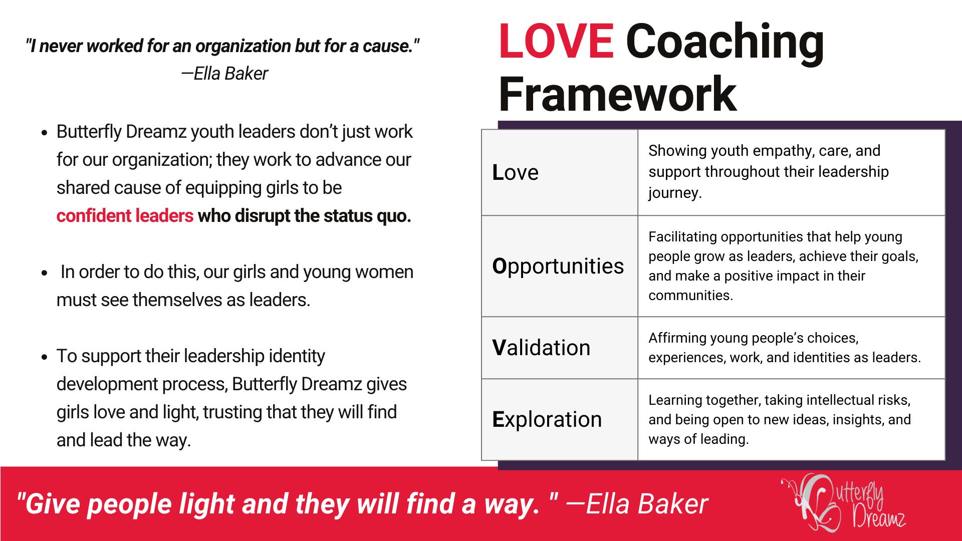 Now that we have learned a little bit more about each other. Let’s talk about why we decided to be part of the Butterfly Dreamz community. Review our LOVE Coaching Framework and discuss the following questions: