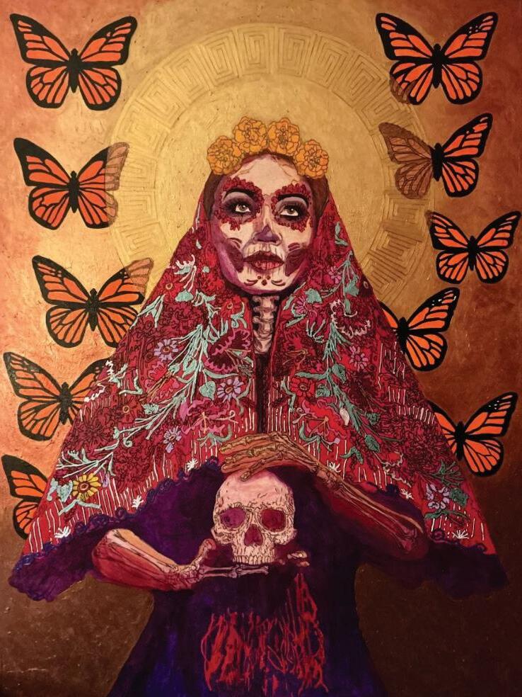 This painting, “Journey to Mictlan” is based on and inspired by Mexican (Aztec) religious belief of the afterlife. It is a painting of the Mexican (Aztec) Goddess Mictēcacihuātl the goddess of death or “Lady of the Dead.” Mictēcacihuātl rules the underworld with her husband Mictlantecuhtli. Her job is to watch over the bones of the dead as the souls of the deceased make their way to the afterlife. The Mexican (Aztec) believe the souls of the departed are carried to the afterlife on the wings of the butterflies. As Mexico was colonized by the Spanish, the Mexican (Aztec) religious belief was fused with Catholicism and evolved into Dia De Muertos or Day of the Dead. Mictecacihuatl is shown wearing beautiful traditional Mexican shawl and is adorned with a crown of Cempasuchils (Marigolds) which is the traditional flower used to this day in Dia de Muertos.