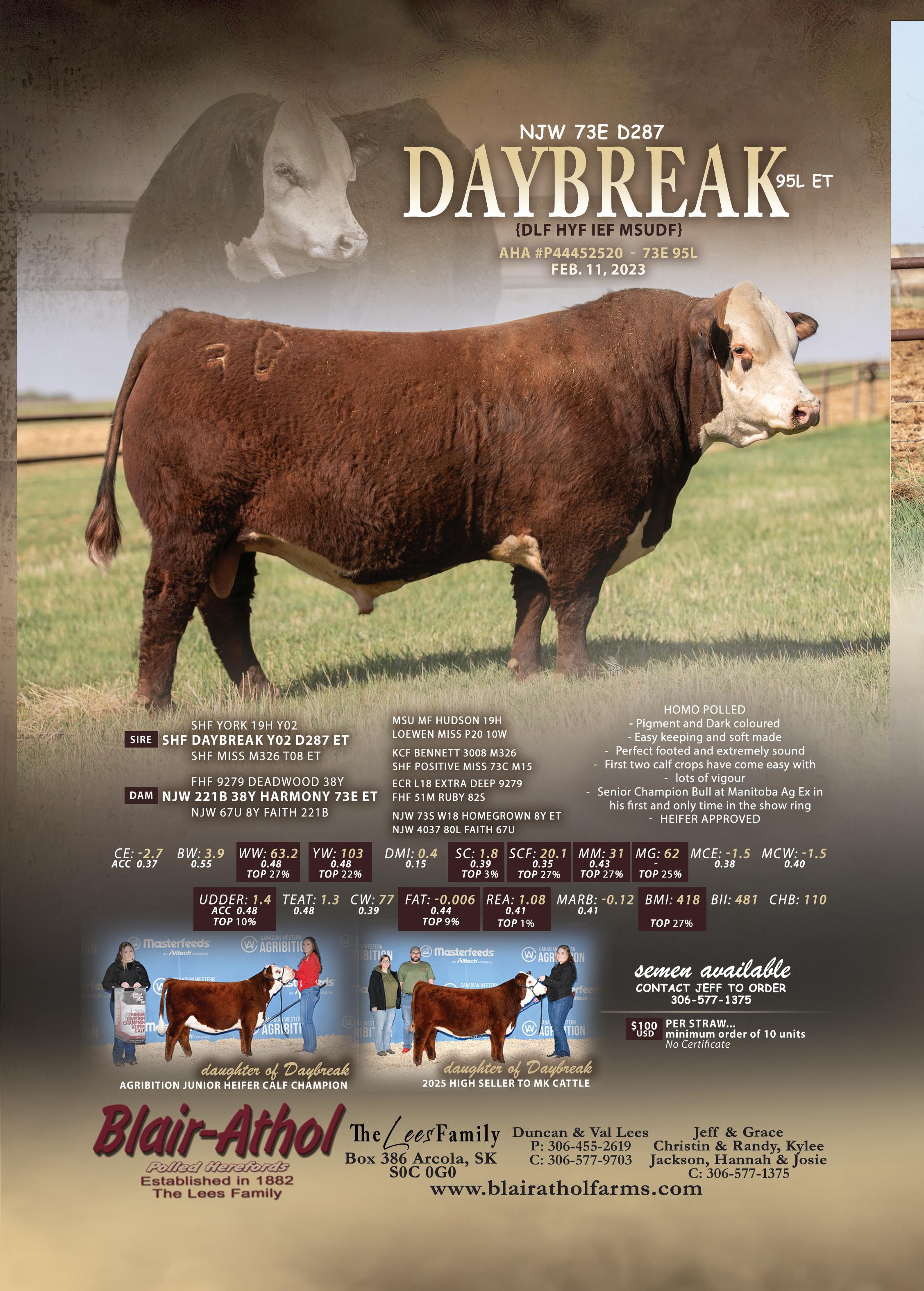/Straw, 10 straw minimum; /Certificate. Contact Behrends Farms for semen