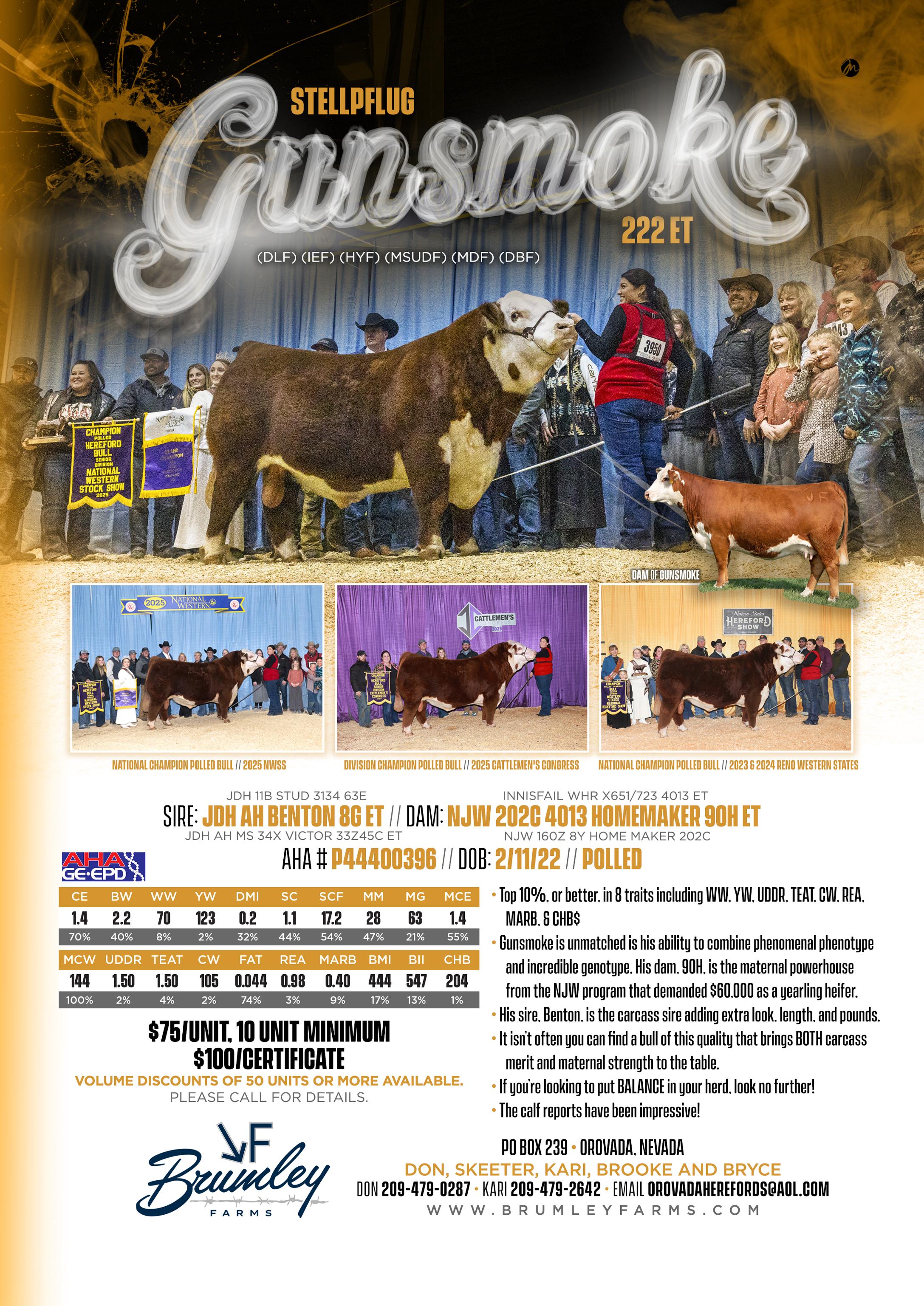 $5,000 for any combination of 50 straws or certificates. Additional certificates $100. Contact Sandhill for semen.