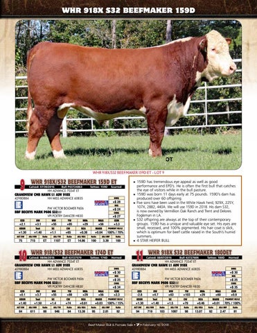 has tremendous eye appeal as well as good performance and EPD’s. He is often the first bull that catches the eye of visitors while in the bull pasture. ★★ 159D was born 11 days early at 75 pounds. 159D’s dam has produced over 60 offspring. ★★ Five sons have been used in the White Hawk herd, 929X, 225Y, 107X, 2882, 440A. We will use 159D in 2018. His dam S32, is now owned by Vermillion Oak Ranch and Trent and Delores Fogleman in LA. ★★ S32 offspring are always at the top of their contemporary groups. 159D has a unique and valuable eye set. His eyes are small, recessed, and 100% pigmented. His hair coat is slick, which is optimum for beef cattle raised in the South’s humid summers. ★★ 4 STAR HEIFER BULL