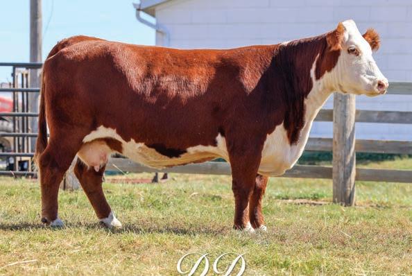 Adrian is a modern day Hereford breeder’s dream. Perfect udder, full pigment, great running gear, desirable phenotype, and an impressive EPD profile. We ask our cows to do a lot, and Adrian is one that flat gets it done. Her dam and grandam both are former Heart of America Sale highlights, now in production at Goldstein Farms. Bred AI on 6/3/25 to HUTH CLC WF Deluxe K016. Pasture exposed to GGSC MGS Ladies Man H09 ET (Full Brother to Montgomery) from 6/11/25 - 9/20/25.Consigned by Benedict Herefords - Noah Benedict, 605 CR 2300 N Dewey, IL 61840, 217-372-8009.