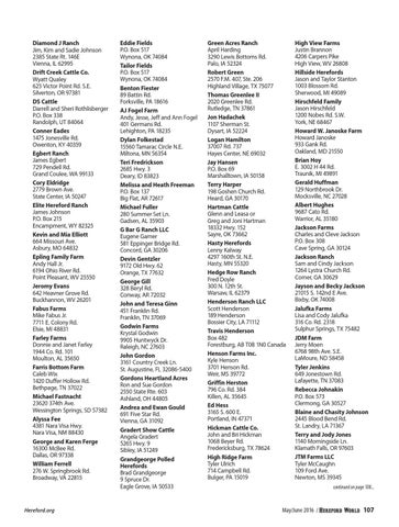 Green Acres Ranch April Harding 3290 Lewis Bottoms Rd. Palo, IA 52324 Robert Green 2570 F.M. 407, Ste. 206 Highland Village, TX 75077 Thomas Greenlee II 2020 Greenlee Rd. Rutledge, TN 37861 Jon Hadachek 1107 Sherman St. Dysart, IA 52224 Logan Hamilton 37007 Rd. 737 Hayes Center, NE 69032 Jay Hansen P.O. Box 69 Marshalltown, IA 50158 Terry Harper 198 Goshen Church Rd. Heard, GA 30170 Hartman Cattle Glenn and Leasa or Greg and Joni Hartman 18332 Hwy. 152 Sayre, OK 73662 Hasty Herefords Lenny Kalway 4297 160th St. N.E. Hasty, MN 55320 Hedge Row Ranch Fred Doyle 300 N. 12th St. Warsaw, IL 62379 Henderson Ranch LLC Scott Henderson 189 Henderson Bossier City, LA 71112 Travis Henderson Box 482 Forestburg, AB T0B 1N0 Canada Henson Farms Inc. Kyle Henson 3701 Henson Rd. Weir, MS 39772 Griffin Herston 796 Co. Rd. 384 Killen, AL 35645 Ed Hess 3165 S. 600 E. Portland, IN 47371 Hickman Cattle Co. John and Bri Hickman 1068 Beyer Rd. Fredericksburg, TX 78624 High Ridge Farm Tyler Ulrich 714 Campbell Rd. Bulger, PA 15019