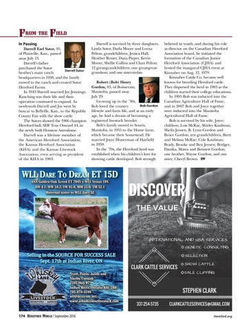 In Passing Darrell Earl Sutor, 95, of Plainville, Kan., passed away July 13. Darrell’s father purchased the Sutor Darrell Sutor brother’s main ranch headquarters in 1938, and the family moved to the ranch and created Sutor Hereford Farms. In 1943 Darrell married Joy Jennings. Ranching was their life and their operation continued to expand. As newlyweds Darrell and Joy went by boxcar to Bellville, Kan., to the Republic County Fair with the show cattle. The Sutors showed the 1966 champion Hereford bull, SHF True Onward 44, in the newly built Houston Astrodome. Darrell was a lifetime member of the American Hereford Association, the Kansas Hereford Association (KHA) and the Kansas Livestock Association, even serving as president of the KHA in 1963.