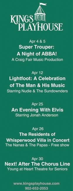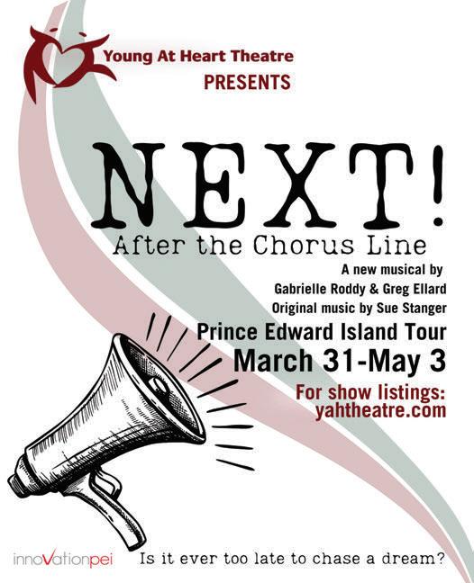 of NEXT! include: April 5, 2 pm, at Lower Montague Women’s Institute, 88 Lower Montague Rd, (902-9691391); April 10, 7:30 pm, at Milton Community Hall, 7 New Glasgow Rd, Rte 224, North Milton (miltoncommunityhall@gmail.com); April 12 and 26, 2 pm, at Benevolent Irish Society, 582 North River Rd, Charlottetown (benevolentirishsocietyofpei.com/ events); April 15, 12:30 pm, at Cornwall 50+ Club, 29 Cornwall Rd (902-393-2531); April 16, 2 pm, at Three Rivers 50+ Club, 4279 Chapel Rd, Cardigan, (902-583-2662); April 19, 2 pm, Seniors Active Living Centre, Charlottetown, (902-628-8388 or salc@ pei.aibn.com); April 26, 7 pm, Eastern Kings Community Centre, 85 Munns Rd, Souris (902-357-2046 or easternkingscommunitycenter@gmail.com); April 30, 2 pm, at Kings Playhouse, 65 Grafton St, Georgetown (kingsplayhouse.com or 1-888-346-5666); April 30, 7 pm, at Uigg Community Hall, 4894 Murray Harbour Rd, Vernon River (902-628-7209); and May 3, 2 pm, St. Peters Circle Club, St. Peters Bay (902-393-1482).