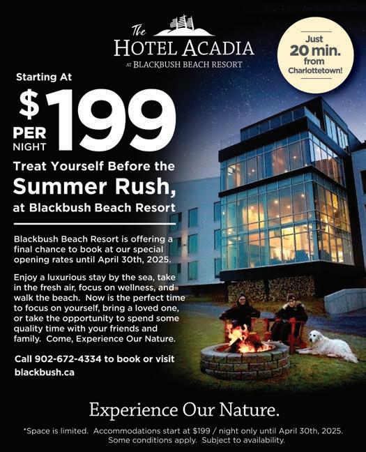 Red Shores Unplugged on Saturdays (5–8 pm): Wayne Gallant (Apr 5); Roger Stone (12); Billy White (19); Lawrence Maxwell (26). 21 Exhibition Dr, Charlottetown.
