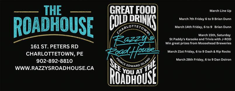 Saturdays (6–9 pm): Lawrence Maxwell (Mar 1); Wayne Gallant (8); no show (15); Billy White (22); Karen & Mike Penton (29). 21 Exhibition Dr, Charlottetown.