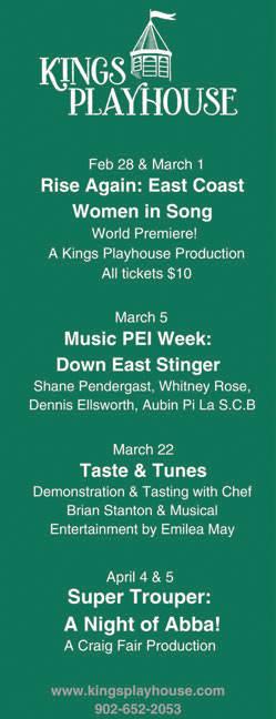 Matinee and/or evening performances will run at Florence Simmons Performance Hall in Charlottetown from March 14–16 and 20–23. Evening