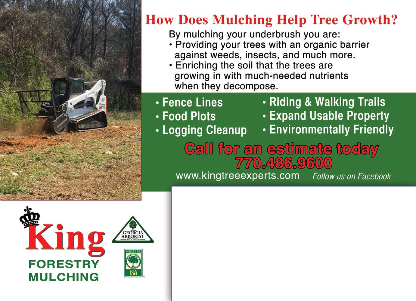 dangerous tree & Storm damage specialists • Underbrush Mulching ing TREE EXPERTS INC www.kingtreeexperts.com 770-486-9600 • Retention Ponds • Fence Lines • Reclaim Overgrown Property • Feeding Plots • Walking Trails • Lake Views Our Fleet of Equipment includes 2 Cranes with Certified Operators for Safe and Efficient Tree Removal • Large Fleet of Modern Equipment for Large & Small Jobs • Tree Removal & Trimming • Insurance Claims • Stump Grinding • Wood Chips Family Owned & Operated Since 1970 Licensed INSURED & We have the most turf friendly equipment in our industry! How Does Mulching Help Tree Growth? Call for an estimate today 770.486.9600 www.KingTreeExperts.com • Fence Lines • Food Plots • Logging Cleanup • Riding & Walking Trails • Expand Usable Property • Environmentally Friendly By mulching your underbrush you are: • Providing your trees with an organic barrier against weeds, insects, and much more. • Enriching the soil that the trees are growing in with much-needed nutrients when they decompose. BEFORE