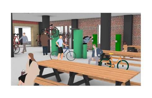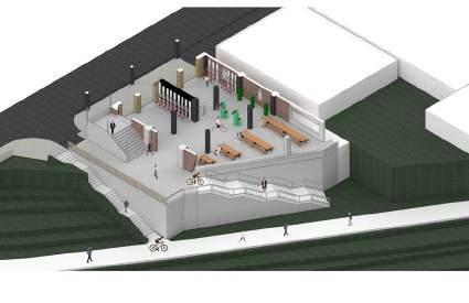 A key aspect of this project is the connection to the historic building and its surrounding bike networks. Access to the building is enhanced through a designed bike ramp that starts from the bayou to the building itself. The ramp leads up to the ground floor, where there are a number of amenities, including bike repair stations, tables, chairs, and bike racks.