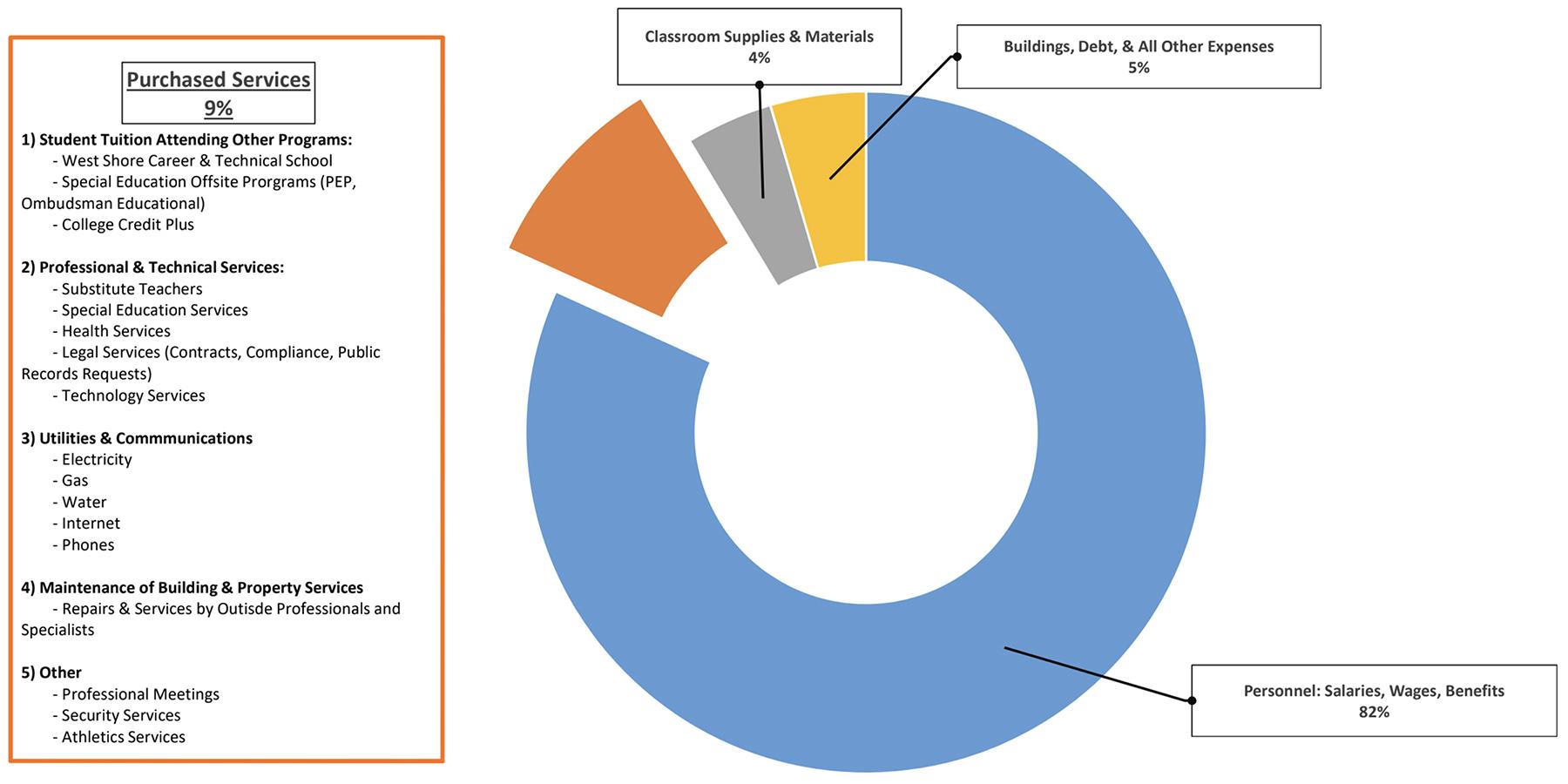 9% Purchased Services: The second-largest budget category is Purchased Services, making up 9% of total expenditures. These are services the district does not or cannot provide inhouse. This includes tuition for students attending West Shore Career & Technical programs, offsite special education facilities and College Credit Plus courses.