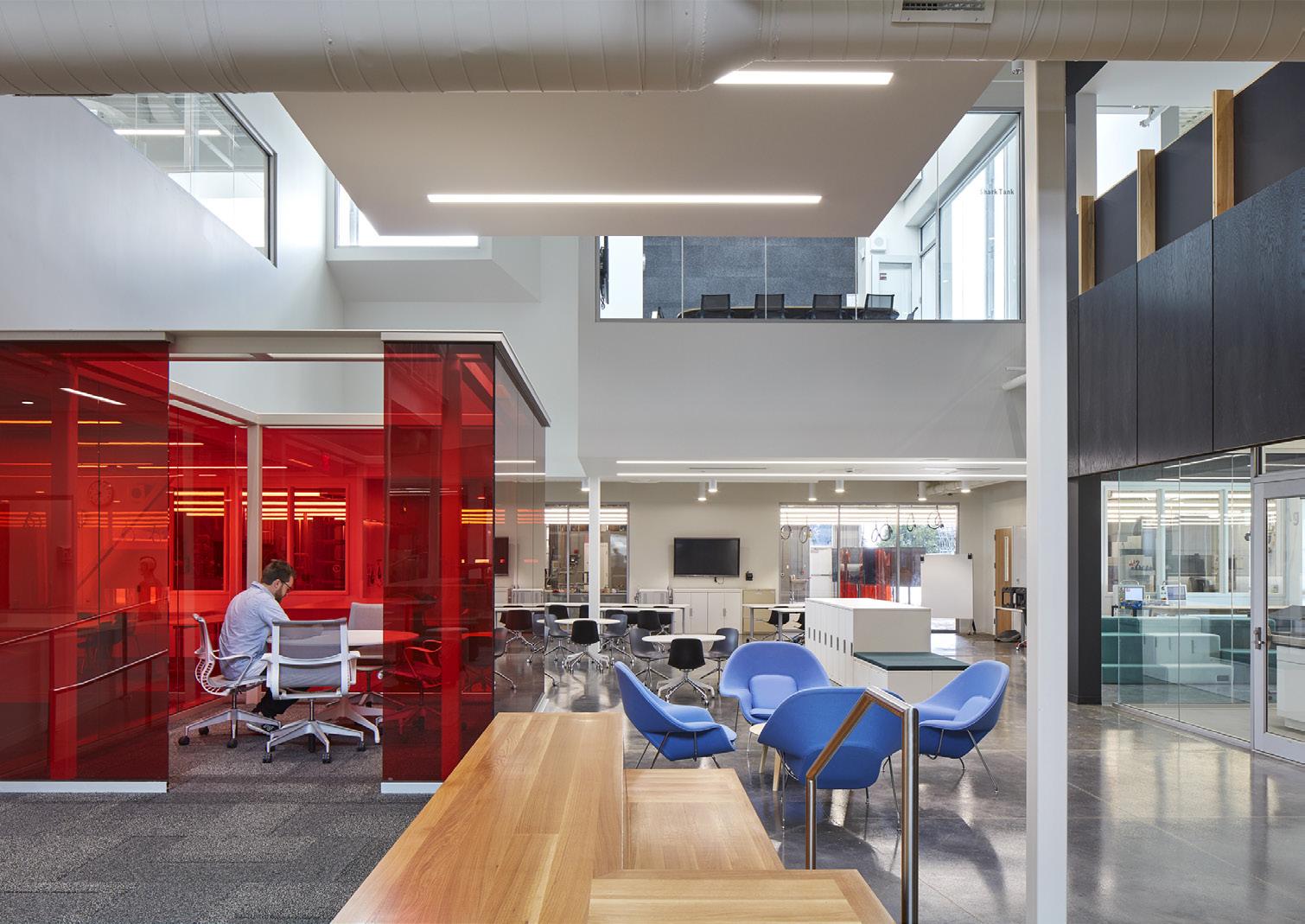 Programming needs are activity-based rather than subject-based: multifunctional labs replace traditional math and science rooms; large-group spaces provide classrooms and collaboration studios; small group spaces provide break-out areas for focused learning. Areas are both defined and interconnected by glass walls, partitions and furniture groupings—a delineation of space that allows each area to remain, both physically and visually, a part of the overall whole.