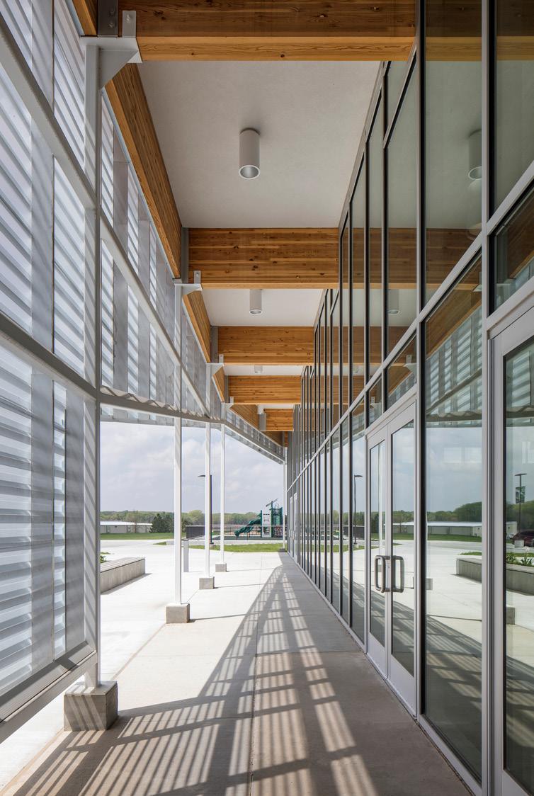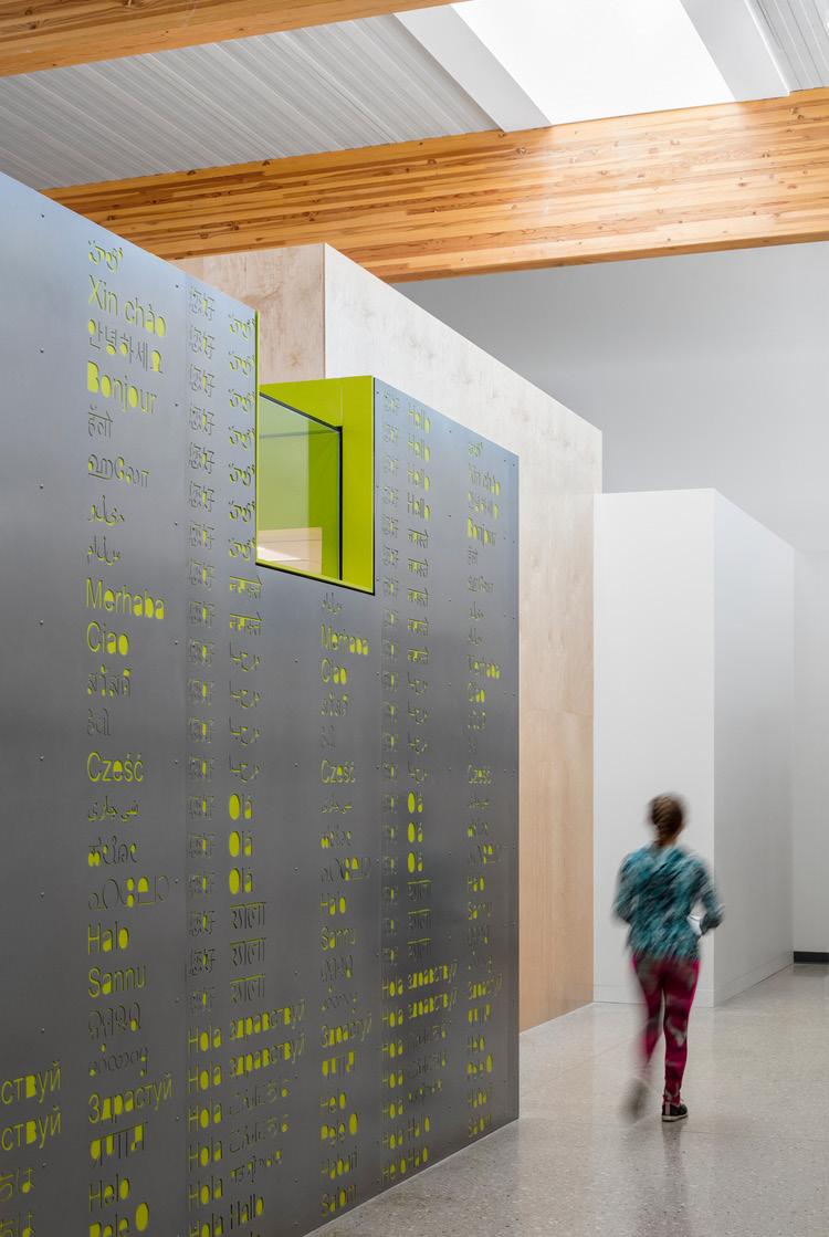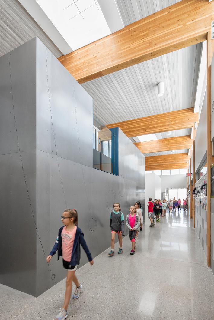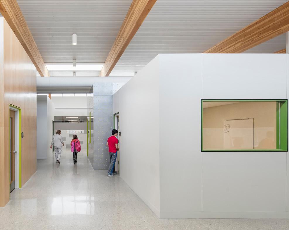 By reorienting the classrooms away from the traditional ‘egg-crate’ design into a resource-centric model, the new design created flexible learning spaces along the central corridor. These rooms, shared by all classes, provided the perfect opportunity for interpretive learning spaces. Using simple materials—wood, glass, and metal— the core subjects are brought to life throughout the most widely-used yet under-utilized space: the hallway.