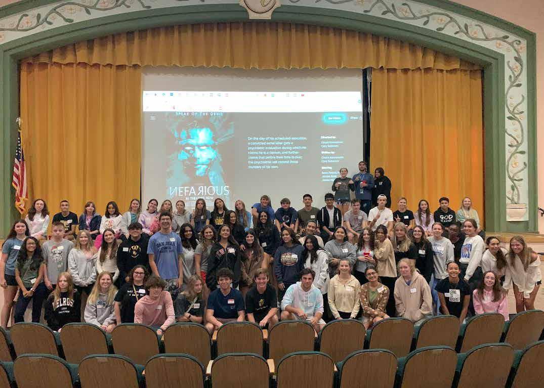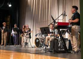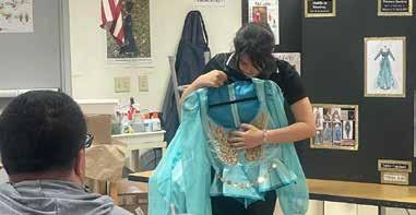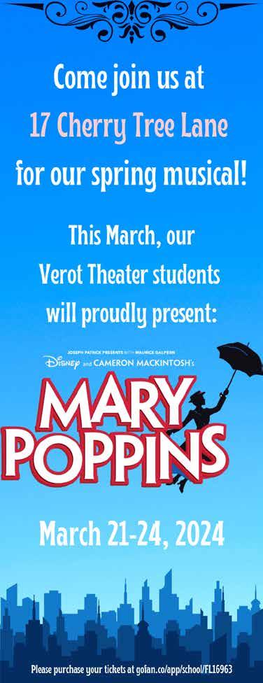 to apply the makeup for a range of characters in the cast, while Ellie Bonds followed the careful cues that gave the lighting a personality of its own. Andrew Pino and Ellianna Trunkett trained on a professional sound board to be able to mix the sound appropriately for each performance. Hannah Cruz and Nora Drake choreographed and taught some of the dancing scenes throughout the show, as did Carlyn Kelly and Hazel Tracey. The bonds built in the Verot Theater Program this fall strengthen our students’ understanding of what it means to truly collaborate, and even former graduates returned to offer their skills. Verot Alum, Grace Greco, Class of '23, returned to photograph her old friends and revisit the stage where she formed so many fond memories. BG