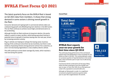 BVRLA Fleet Focus Q3 2021 The latest quarterly focus on the BVRLA fleet is based on Q3 2021 data from members. It shows that strong demand in some sectors is driving overall growth in the fleet. Consumer demand and rapid growth in commercial vehicle orders are underpinning growth and offsetting long-term declines in the BCH sector. The van fleet continues to achieve record highs and demand seems to be accelerating. Although the BCH car fleet continues its long-term decline, this partly reflects a switch to salary sacrifice, while leasing executives forecast a potential return to growth in business leasing over the next year, driven by increasing economic activity. Plug-in vehicles are helping to reshape the leasing sector; business leasing of EVs continues to be driven by tax incentives, but there is also evidence of growing interest among personal contract hire customers, as one in 10 new leasing registrations is now a battery electric vehicle. This shift continues to drive down average CO2 levels, which reached a new low during the quarter.