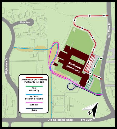 ECSE students will be dropped off and picked up at the back of the school. Please refer to the pink lines on the map. Enter from FM 3254 , drop students off in the back, and exit through the Cowboy Church parking lot.