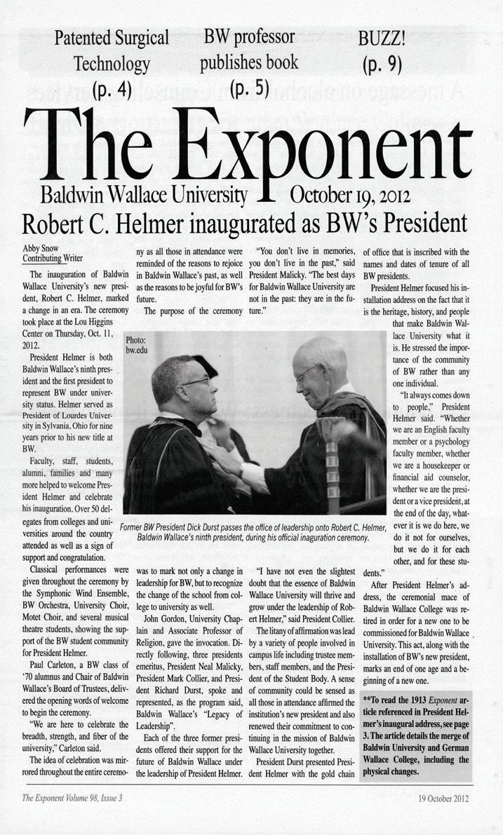 In The Exponent’s third issue of 2012, the paper covered the inauguration of President Bob Helmer, the first BW president to begin his tenure after it officially became designated as a university. Classical performances from a variety of campus musicians were strung throughout the ceremony. The invocation was provided by the then University Chaplain and associate professor of religion, John Gordon. Three of the University’s former presidents attended the inauguration to welcome Helmer including President Neil Malicky, President Mark Collier and President Richard Durst. When passing the torch in his inauguration speech, Malicky said: “You don’t live in memories, you don’t live in the past. The best days for Baldwin Wallace University are not in the past: they are in the future.”